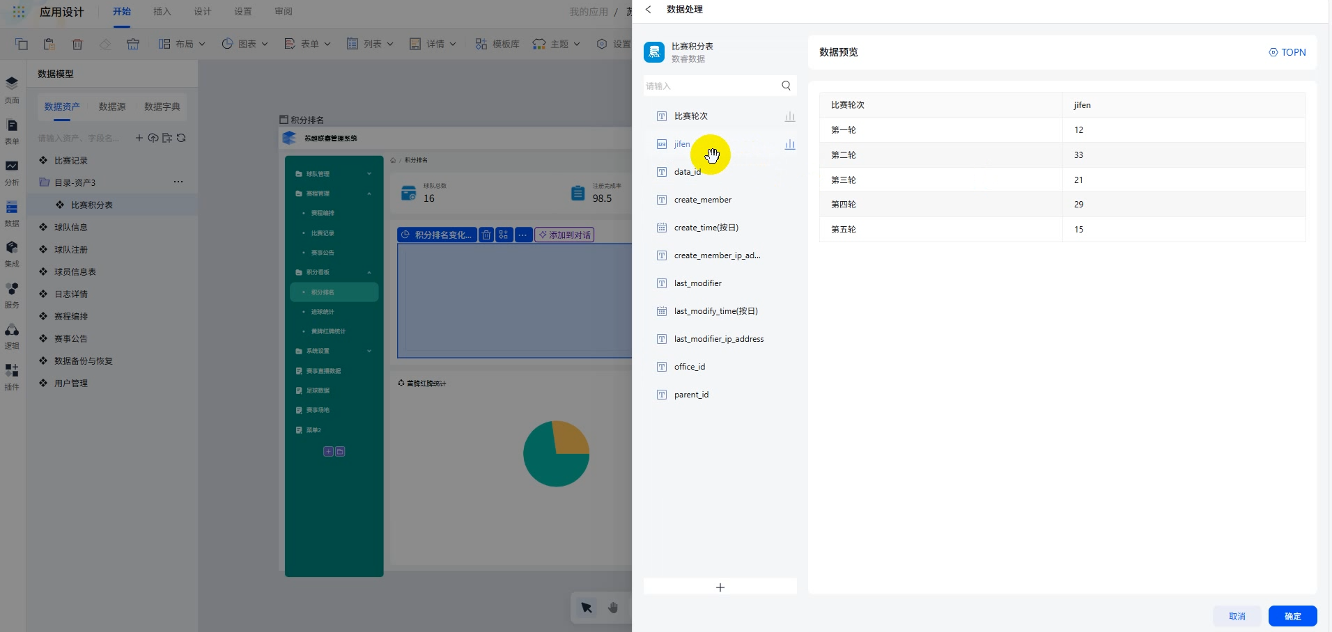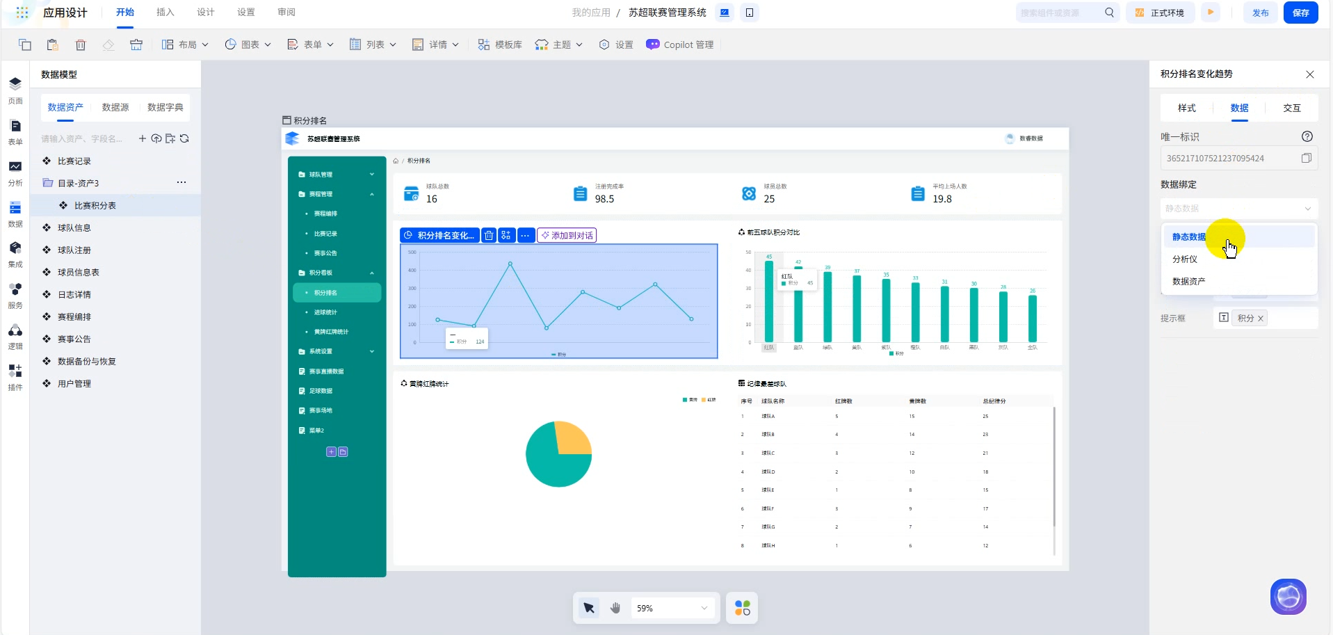 接下来,我们要将【比赛积分数据资产】和【积分排名变化趋势折线图】进行绑定。选中折线图,在右边的配置界面,切换到数据选项下,选择绑定数据资产,选中比赛积分资产后,再拖入比赛轮次、积分两个字段,就实现了折线图展示真实数据。