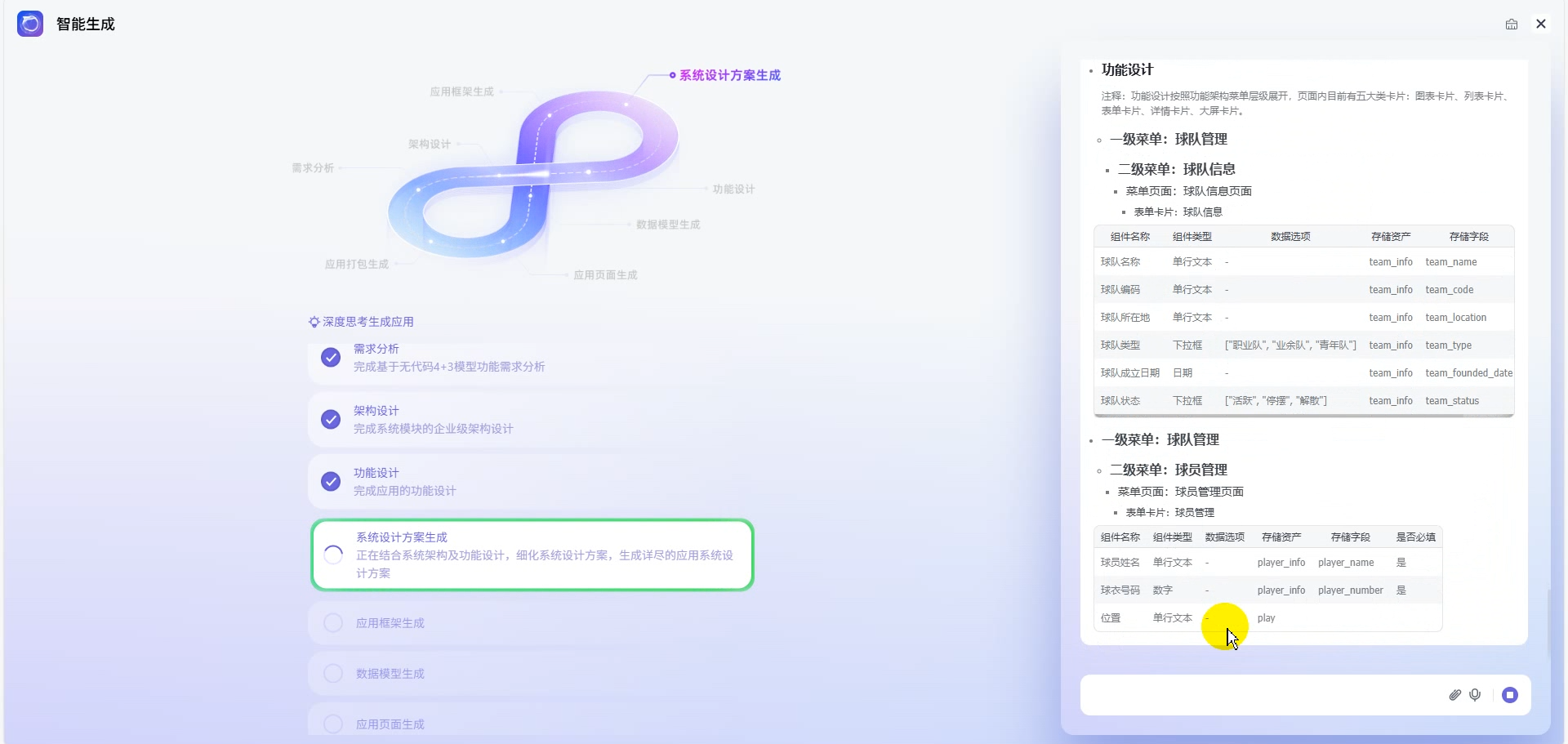开始生成后,智能助手会按照软件工程全链路,从需求设计-架构设计-功能设计逐步设计应用,保障生成的应用贴合真实业务场景。