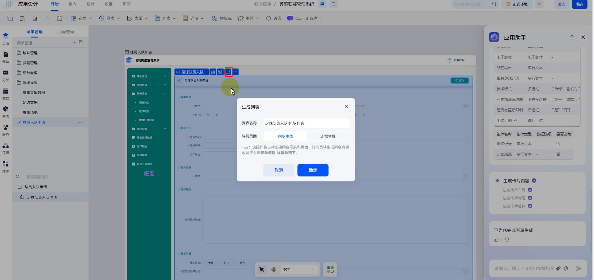 目前的系统还没有球员入队申请表单,手动拖拽字段比较耗时。我们再次使用应用助手,让 AI 帮我们设计。