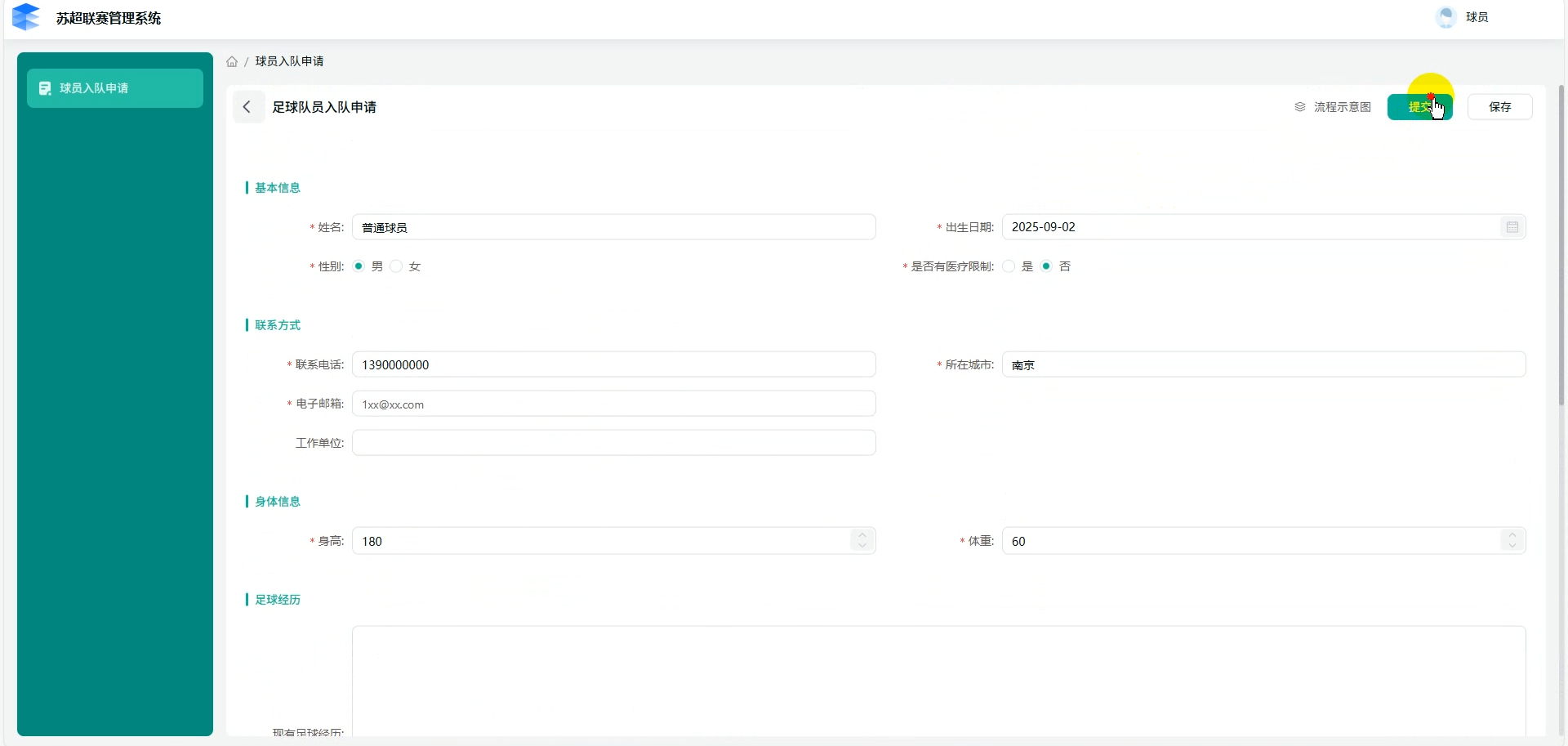 • 先登录球员账号,只能访问入队申请菜单,提交申请