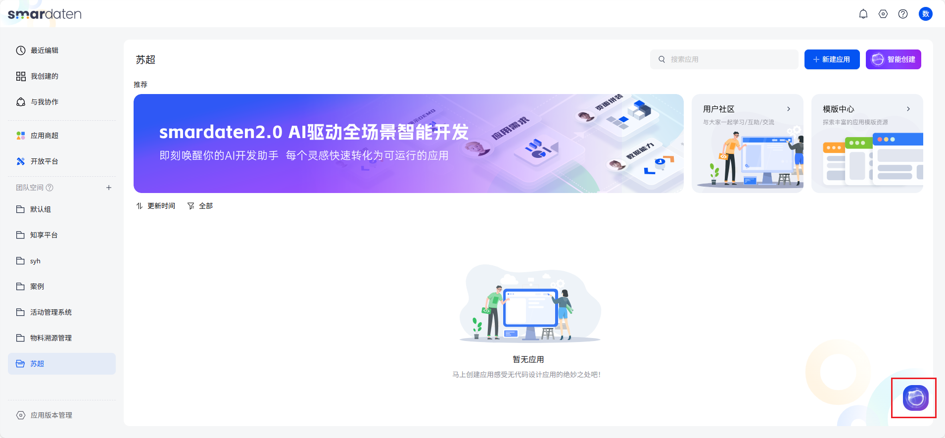登录 smardaten 工作台后,最先看到的,就是右下角的智能助手图标,这是使用所有 AI 能力的统一入口,我们点击唤起。