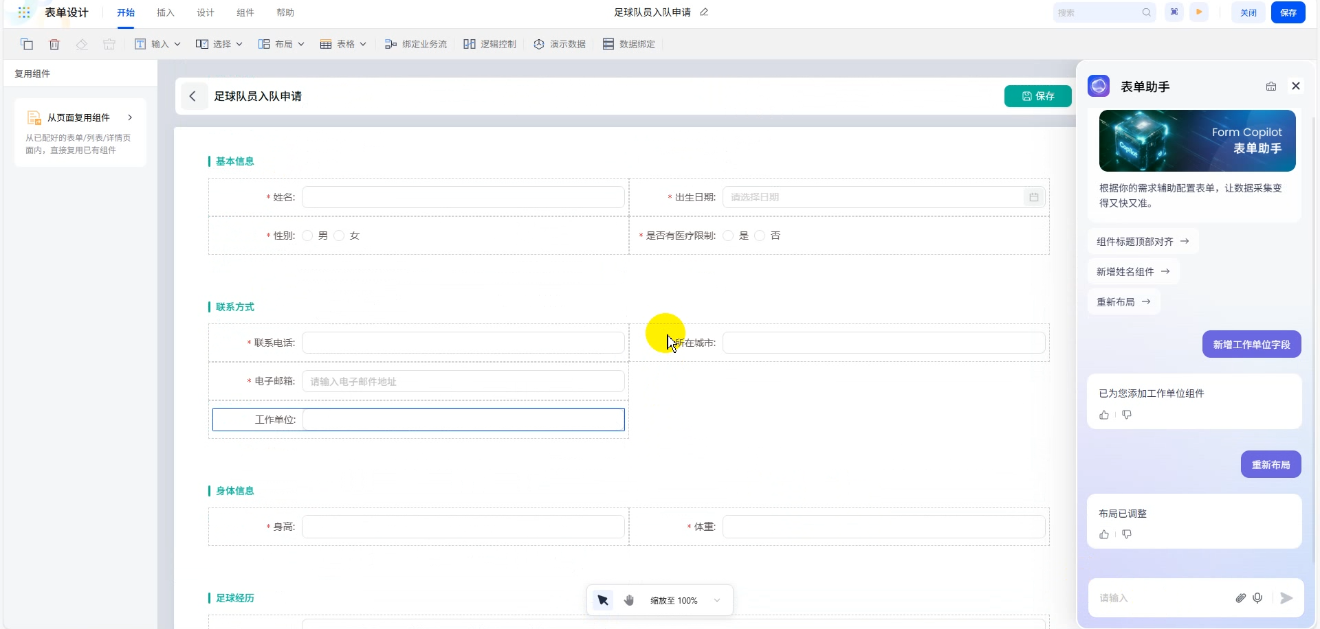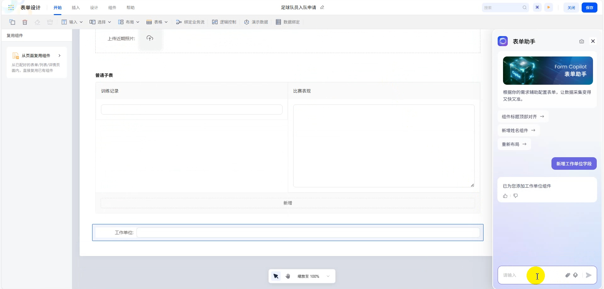 AI 帮我们设计的表单字段已经挺全面了,但还是缺少一个工作单位字段。直接和助手说出需求,输入“新增工作单位字段”,就能自动帮我们完成添加。