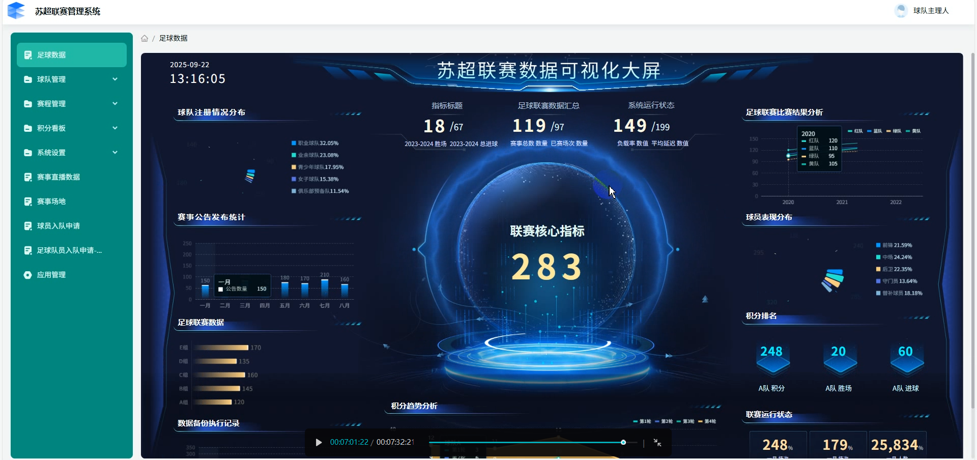 • 数据大屏模块:集中呈现球队积分情况、球员表现情况、进球效率分析等,助力赛事运营与观众互动。