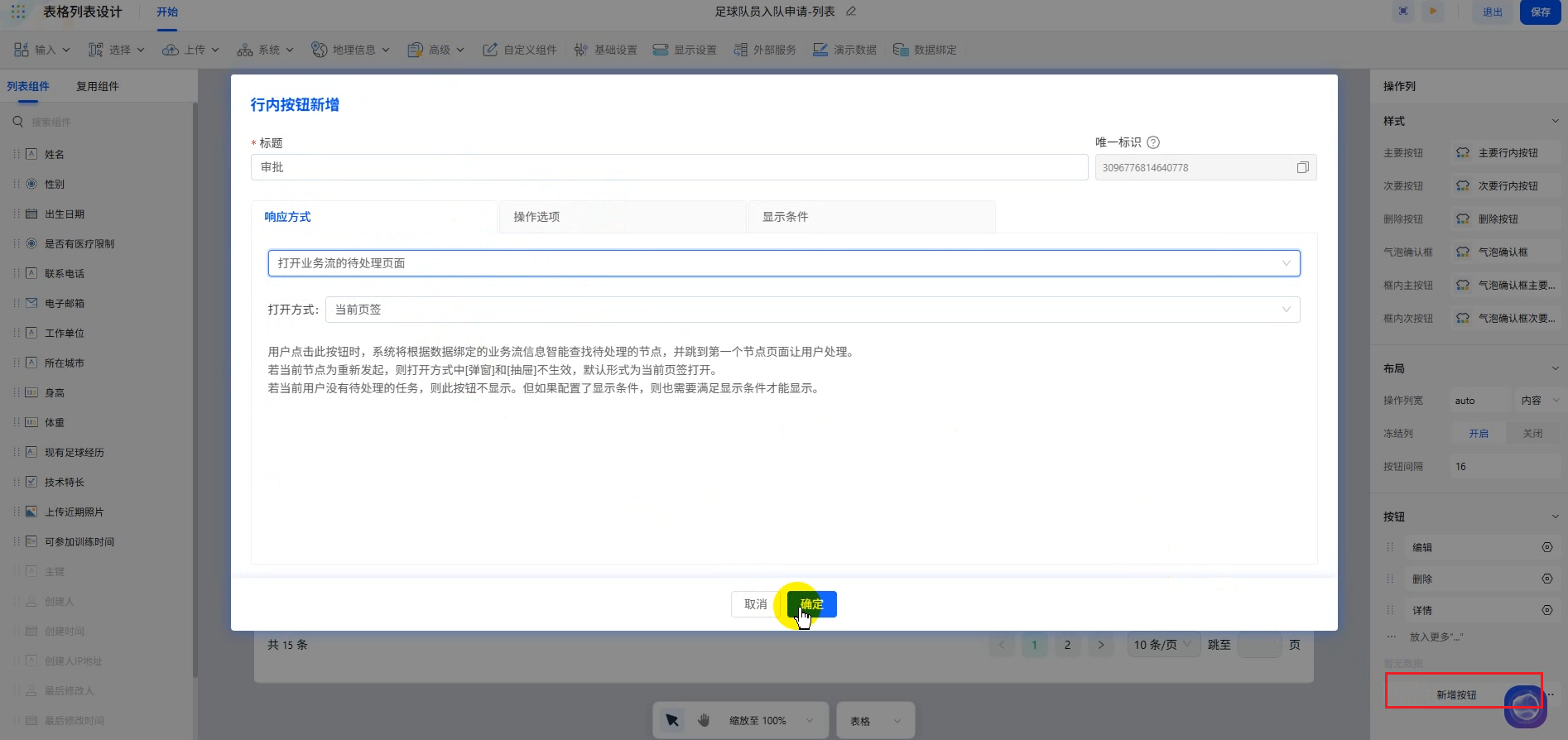 最后我们回到列表页,为列表添加流程审批按钮,让球队主理人点击按钮就能跳转到审批页面进行操作。