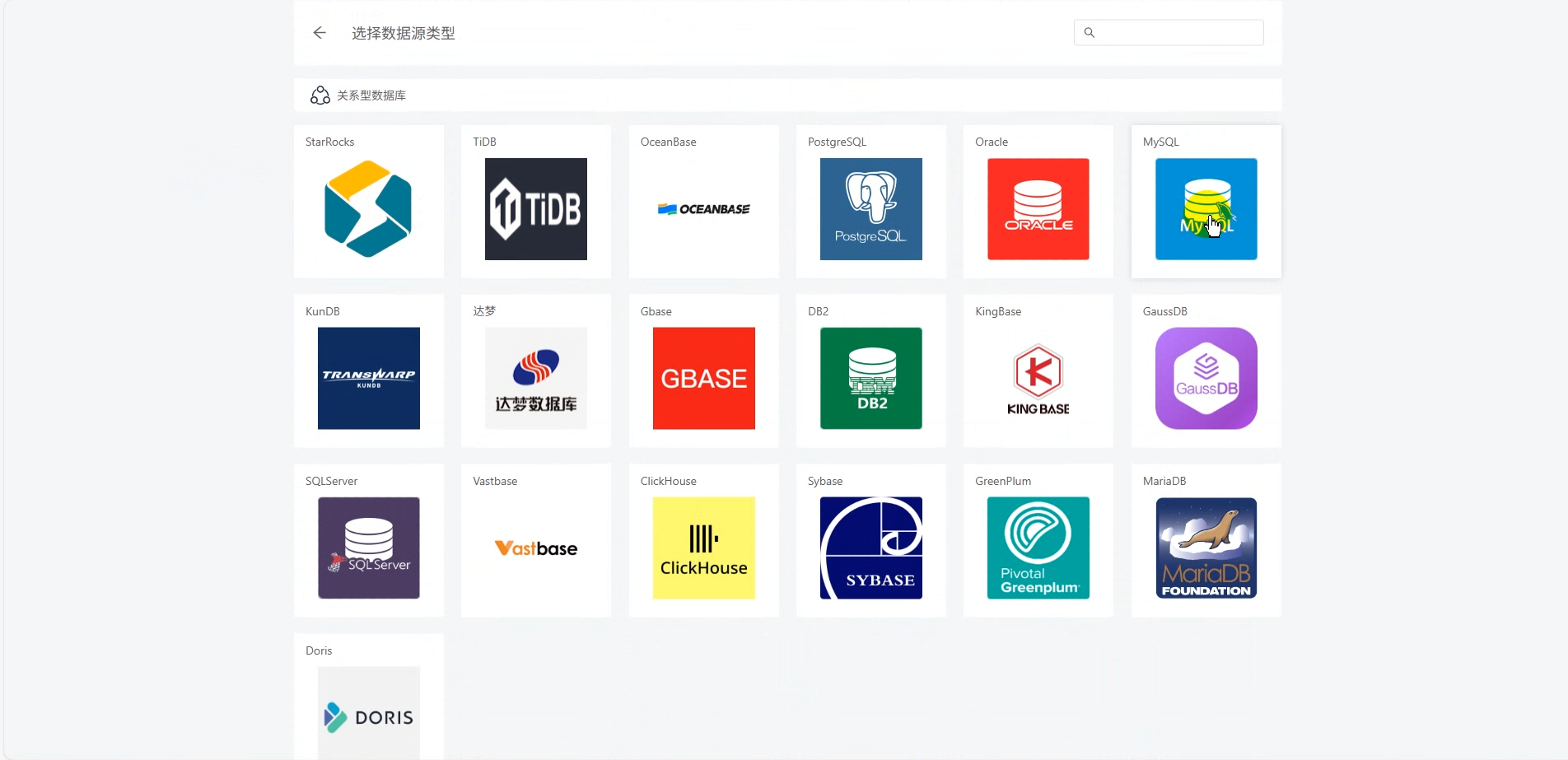 管理系统需要接入真实数据,可以通过可视化界面进行快速配置。我们点击数据模块,选择新增数据源,平台支持 30 余种数据源类型进行快速接入。我们选择 mysql 数据库,进行下一步配置。