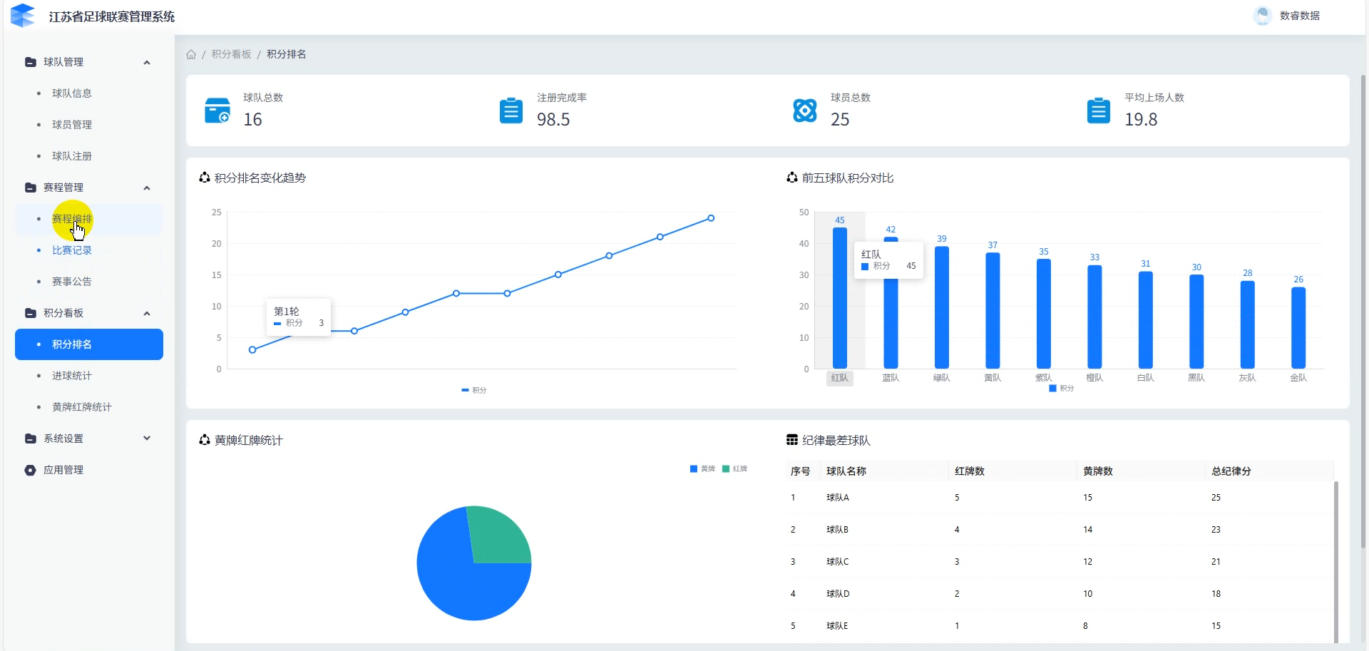 • 支持赛事数据可视化:实时展示比赛数据、积分排名等关键指标,为赛事组织者提供决策支持。