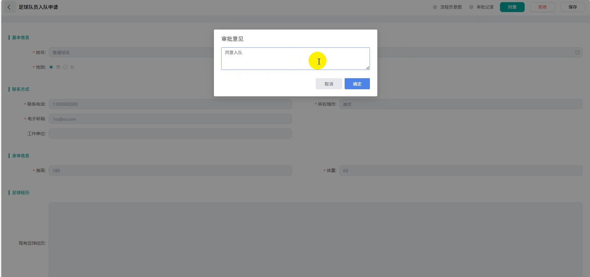 • 登录球队主理人账号,可以访问所有菜单,并对入队申请进行审批