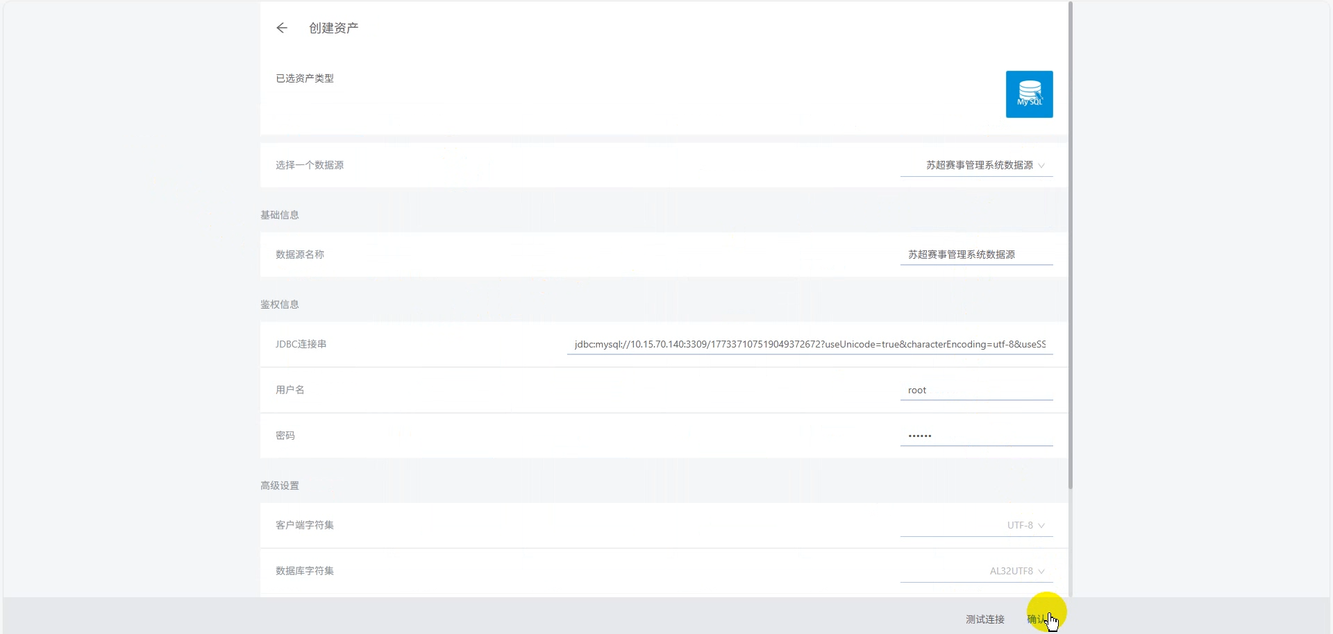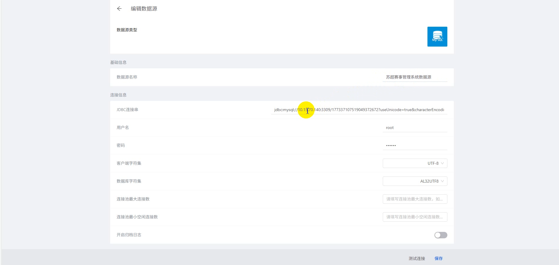 来到 mysql 数据库连接配置界面,我们给数据源起名为“苏超赛事管理系统数据源”,输入数据库的 ip、端口号、数据库名称、账号密码信息,就可以实现快速接入。