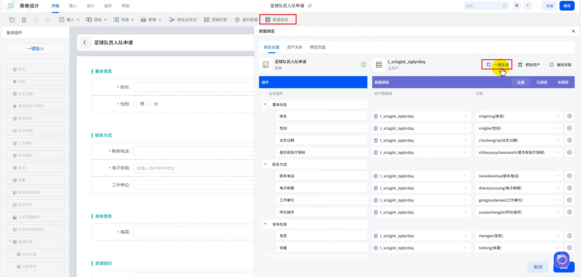 距离整个审批流程跑起来还差最后一步——绑定数据资产,直接让系统帮我们完成建表操作,选择“一键生成”即可。球员在提交申请后,平台会自动将数据保存到生成的数据表中。