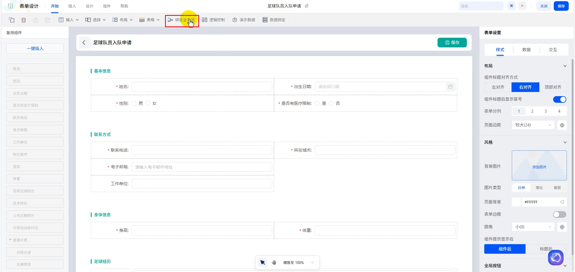球员入队申请流程为“球员发起申请-球队主理人审核”,我们已事先预置了这两个角色,直接在表单里点“绑定业务流”,进入流程设计界面。