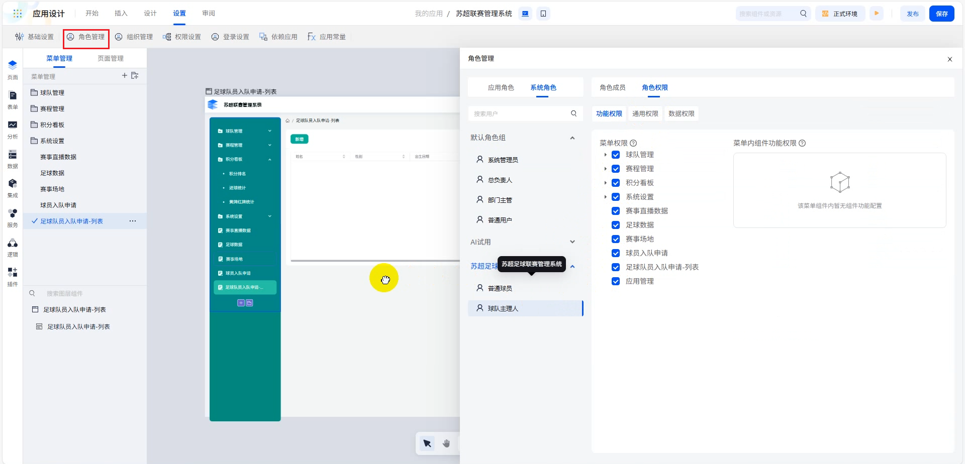 我们在应用编辑页的角色管理模块下,为球员角色仅开放“入队申请提交”权限,保证数据隐私;为球队主理人开放“全部功能”权限,便于统筹管理。