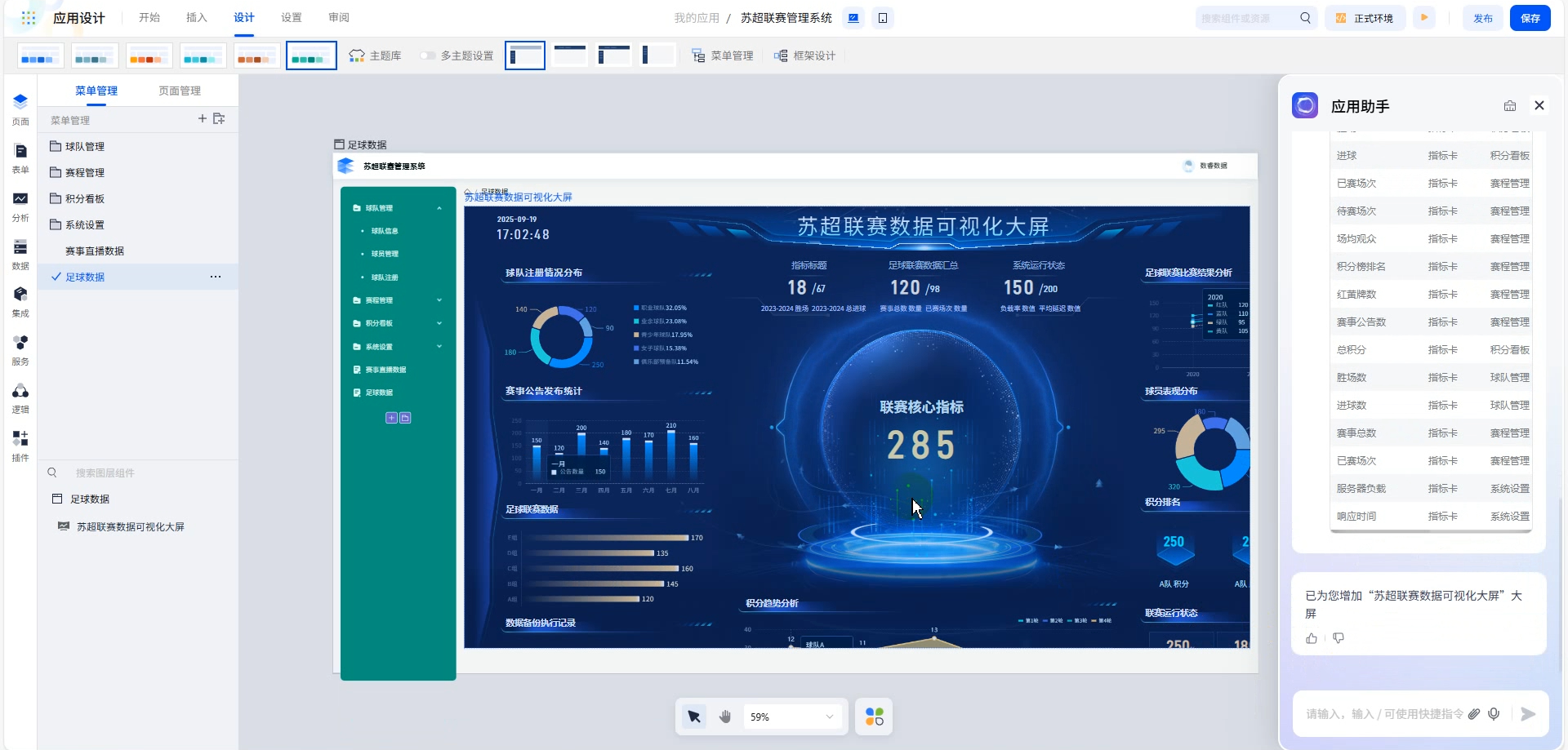 对于管理系统而言,经常需要设计数据大屏展示核心数据,便于管理者做出业务决策。同样我们利用智能助手快速生成。先输入指令“新增足球数据菜单”,自动创建好菜单与页面。继续输入“生成足球联赛数据大屏”的指令,AI 会自动生成包含图表、指标卡的大屏,并且做到了样式美观。