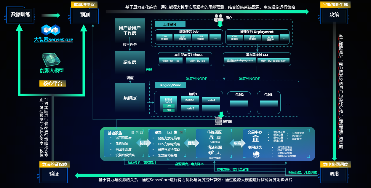 在技术路径上,商汤在临港 AIDC 搭建了算电协同平台,平台构建了融合“数据—算法—策略—执行”的全链条协同系统,通过自研能源大模型、从“服务器”到“能量块”的算法架构等,实现“感知—预测—决策—执行”的闭环智能调度,旨在打造联网调度、普惠易用、绿色安全的智算资源运营新范式。目前,基于能量块的模型能源需求预测准确率已经达到近 90%,调度决策准确率约 95%。在高负载时段,模型能智能触发储能系统调节,实现“电随算动”的动态平衡,大幅提升园区的算力密度与能源利用率。