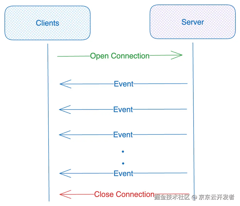 服务器通过 HTTP 长连接持续向客户端发送 “事件”,每个事件需遵循严格的文本格式,以\n\n作为结束符: