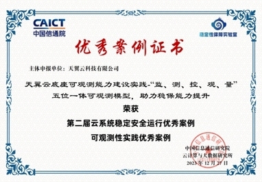 在此次大会上,“天翼云底座可观测能力建设实践”荣获第二届云系统稳定安全运行优秀案例“可观测性实践优秀案例”证书,可观测能力水平与实践应用获业界权威认可。