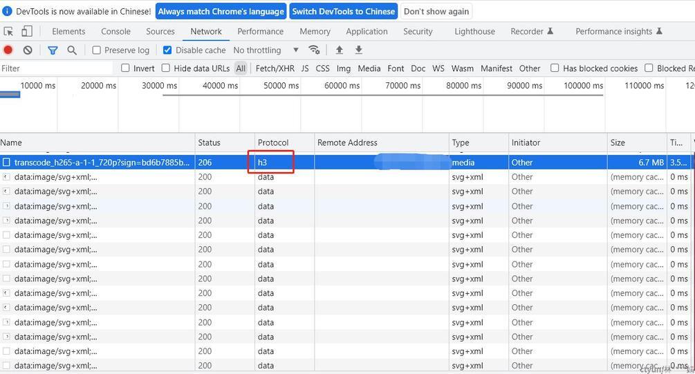 当访问支持 QUIC 的网站时,可以打开开发者工具(快捷键 F12),在 Protocol 列可以查看其具体的协议,如下图所示: