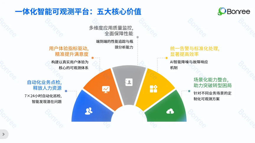 依托 AI+可观测性统一智能告警,重塑故障处理标准。Bonree ONE 通过 AI 智能降噪、告警聚合与标准化处理流程,能有效解决“告警风暴”和误报问题,将告警数量减少 80%,故障平均响应时间从 2 小时缩短至 15 分钟以内,极大提升运维效率与系统稳定性。