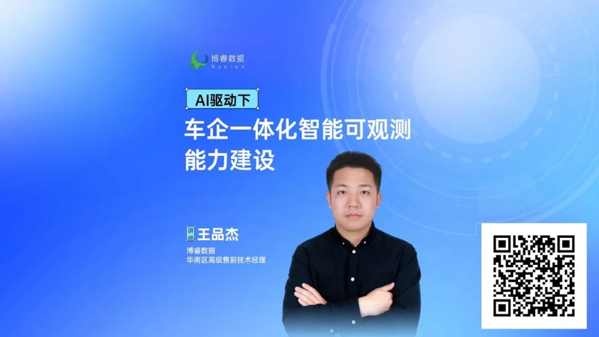 11 月 12 日(周三)15:00,博睿数据华南区高级售前技术经理王品杰带来《AI 驱动下,车企一体化智能可观测能力建设》主题直播,本次直播聚焦车企数字化转型核心痛点,结合行业发展趋势,拆解 AI+可观测性如何助力车企攻克转型挑战,实现降本增效。