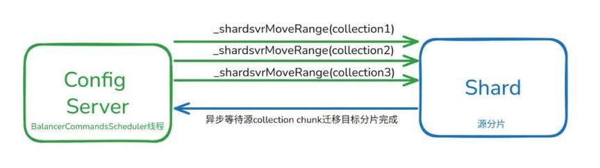 如果有多个表数据不均衡,则“BalancerCommandsScheduler”线程会把这些表对应的迁移任务对象一起发送给源分片,通知源分片对这些表进行并行迁移,然后异步等待 chunk 数据迁移完成,如下图: