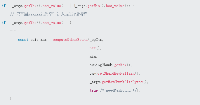 注意这里构造的迁移任务的 max 字段设置为 boost::none ,这个很关键,因为在源分片会识别 max 是否有值,如果没有的话就会进入 split chunk 自动拆分逻辑,请参考后面的 S(T2)章节。