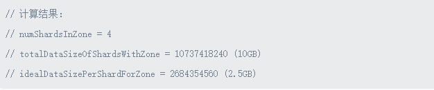 idealDataSizePerShardForZone:代表各个 shard 理想分布 = totalDataSizeOfShardsWithZone / numShardsInZone = 10G / 4 = 2.5G