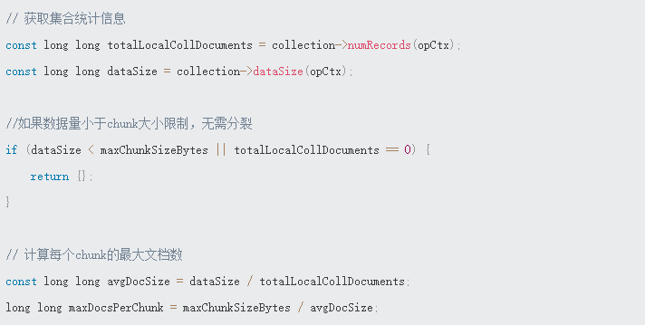 源分片首先获取该分片表在该分片的数据总行数( totalLocalCollDocuments ),同时获取该分片上该表的总数据大小( dataSize ),就可以得出单个文档的平均大小( avgDocSize ), 最后用一个目标 chunk 的大小( maxChunkSizeBytes )除以单个文档平均大小( avgDocSize )即可得到一个目标 chunk 内预期的文档行数( maxDocsPerChunk )。
