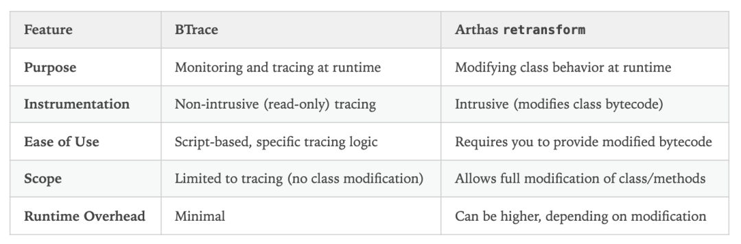 · btrace 使用了:java.lang.instrument,只是在关键函数中注入了额外信息,风险低