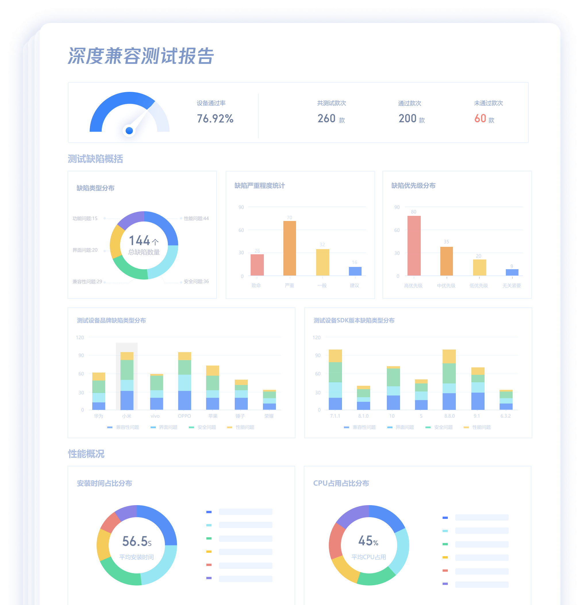 支持安装启动、随机遍历 10 分钟、退出卸载测试过程,提供具备兼容性特性的云端设备,通过模拟真机测试,及时发现应用中出现的兼容性问题。