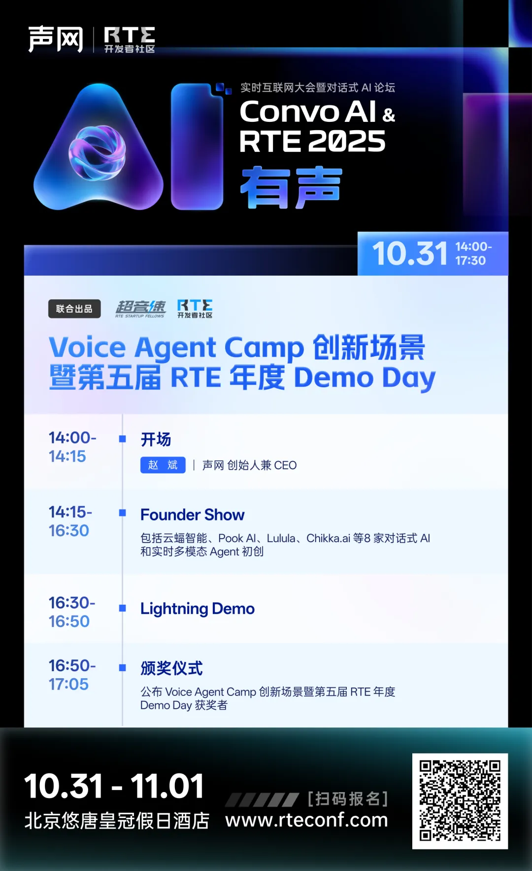 北京,10 月 31 日下午,Convo AI&RTE2025 「实时互联网大会暨对话式 AI 论坛」,欢迎加入我们,一同重塑人机实时互动体验。
