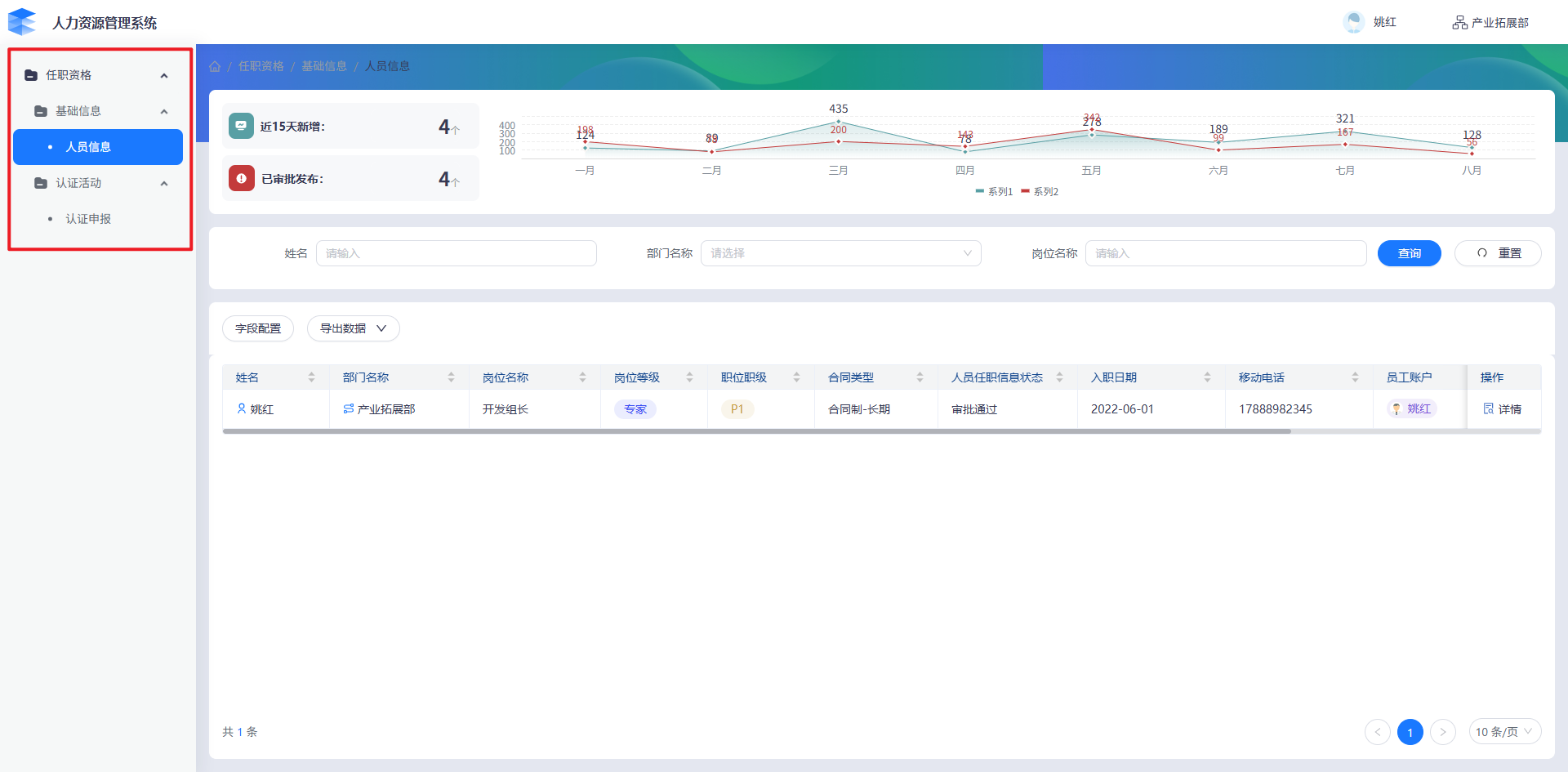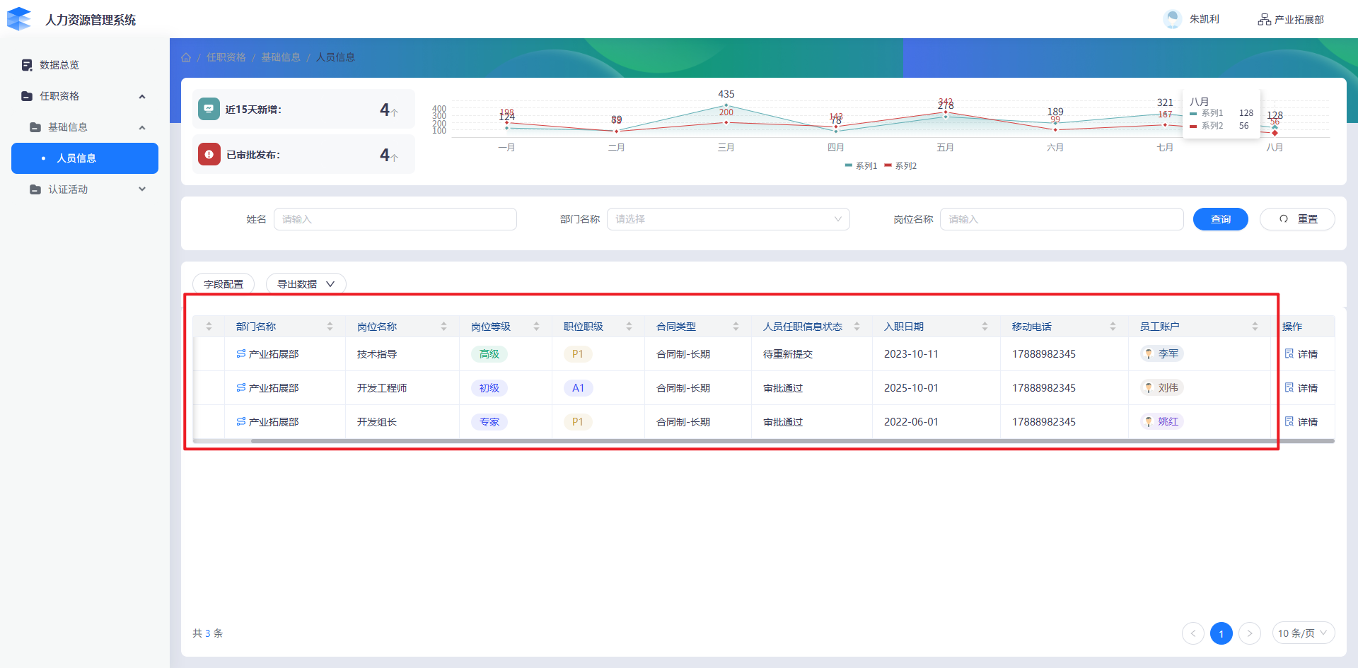 完成配置后,我们登陆一个产业拓展部领导的账户,可以看到产业拓展部领导仅能查看产业拓展部及其下级部门员工的数据。