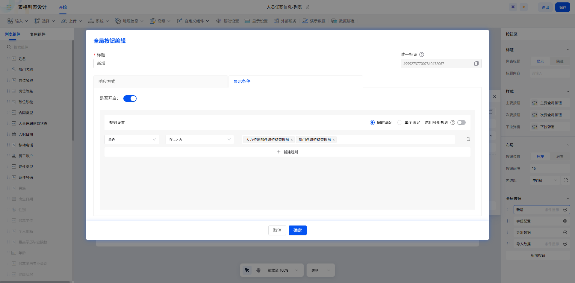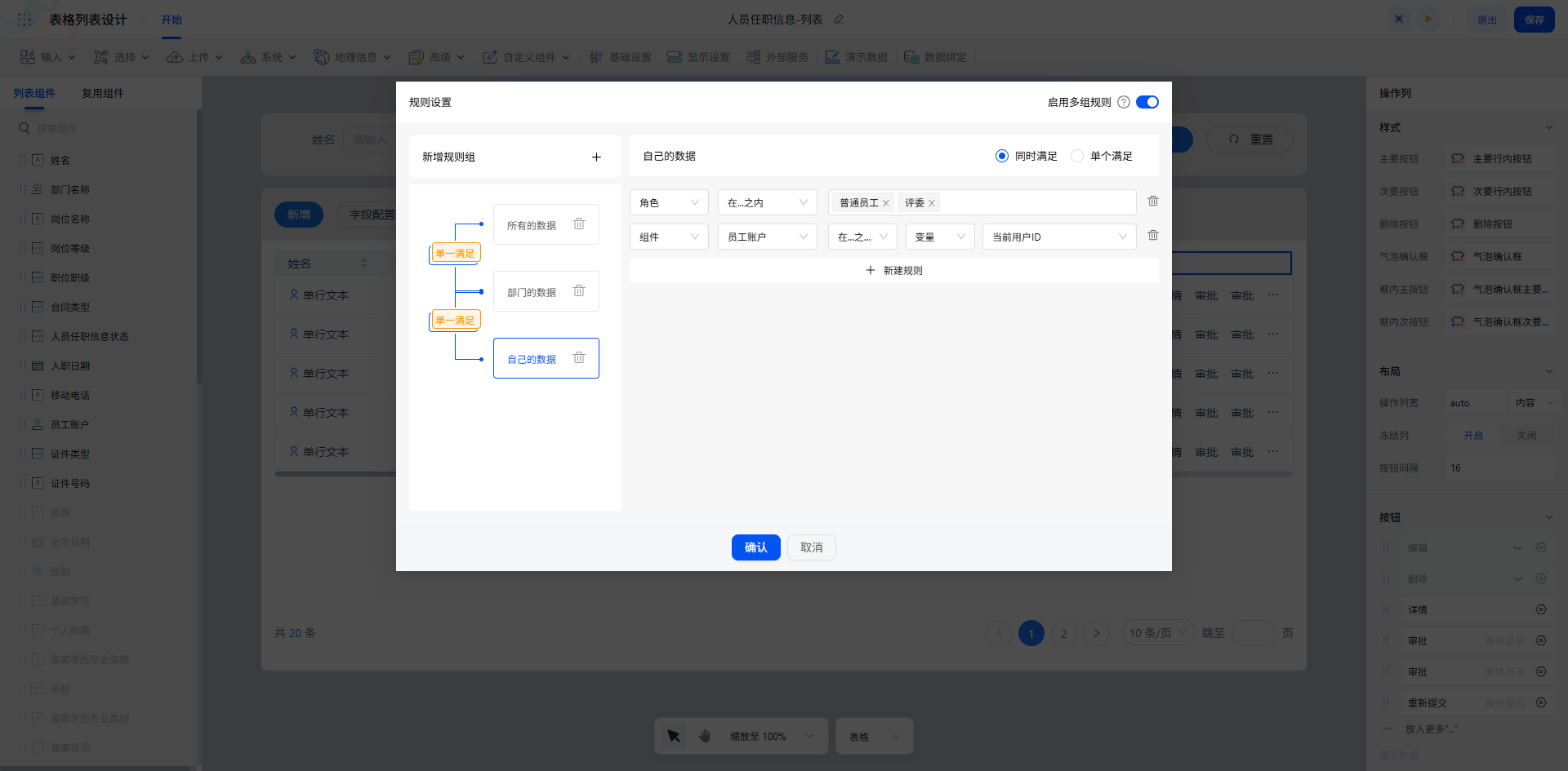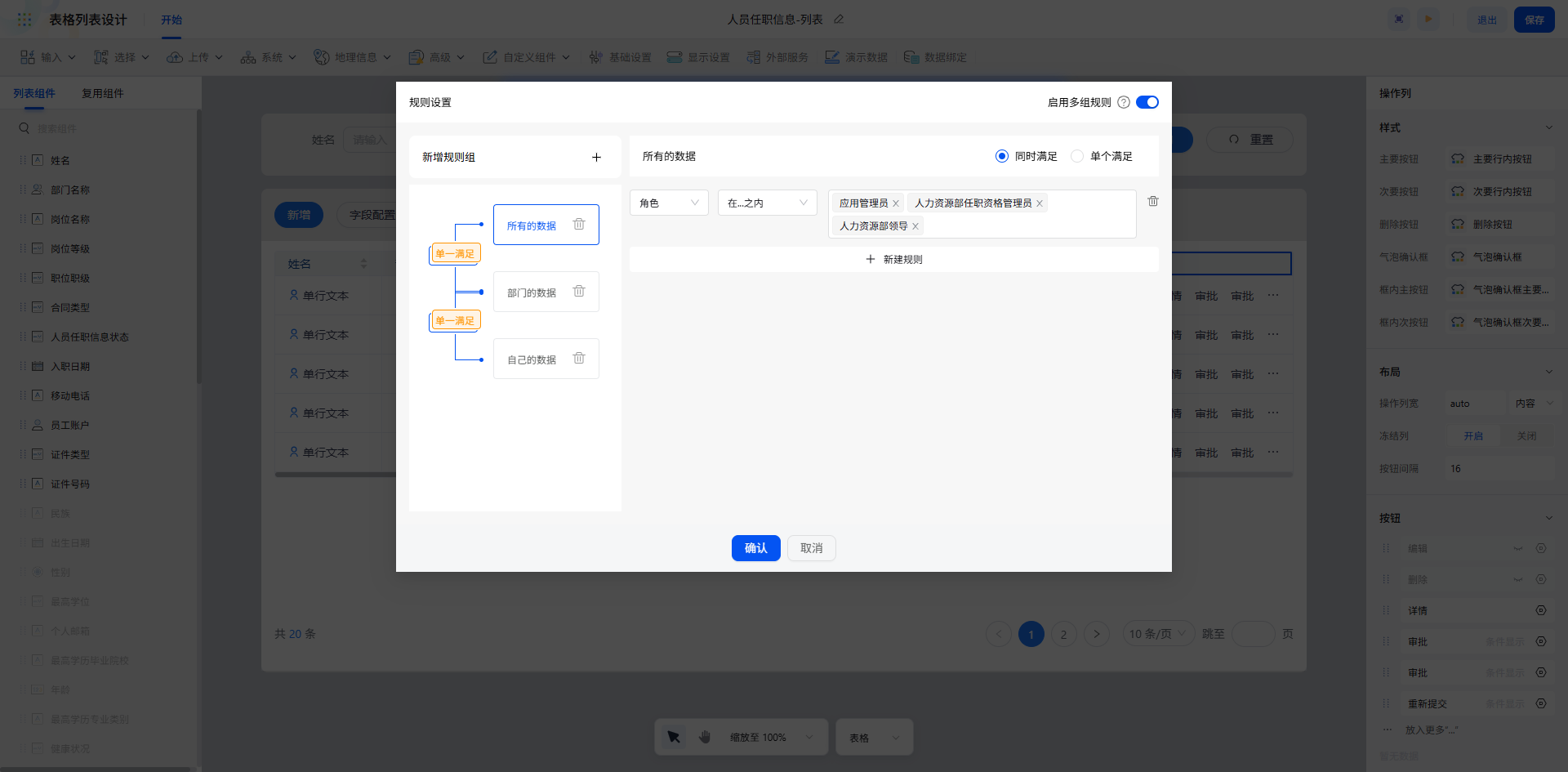 现在,我们已经完成了业务流相关权限的配置。接下来,我们聚焦到人员任职信息的列表页,配置列表的全局按钮和行内按钮的操作权限。