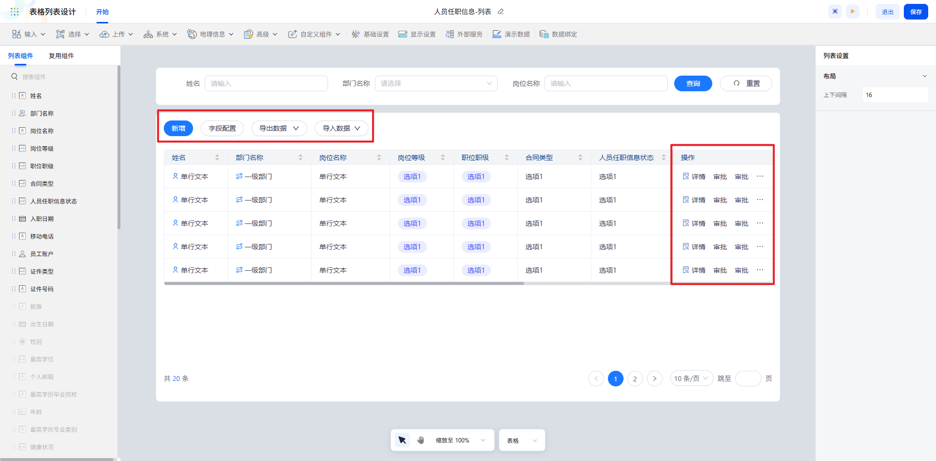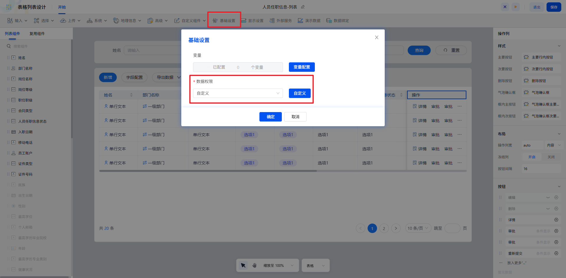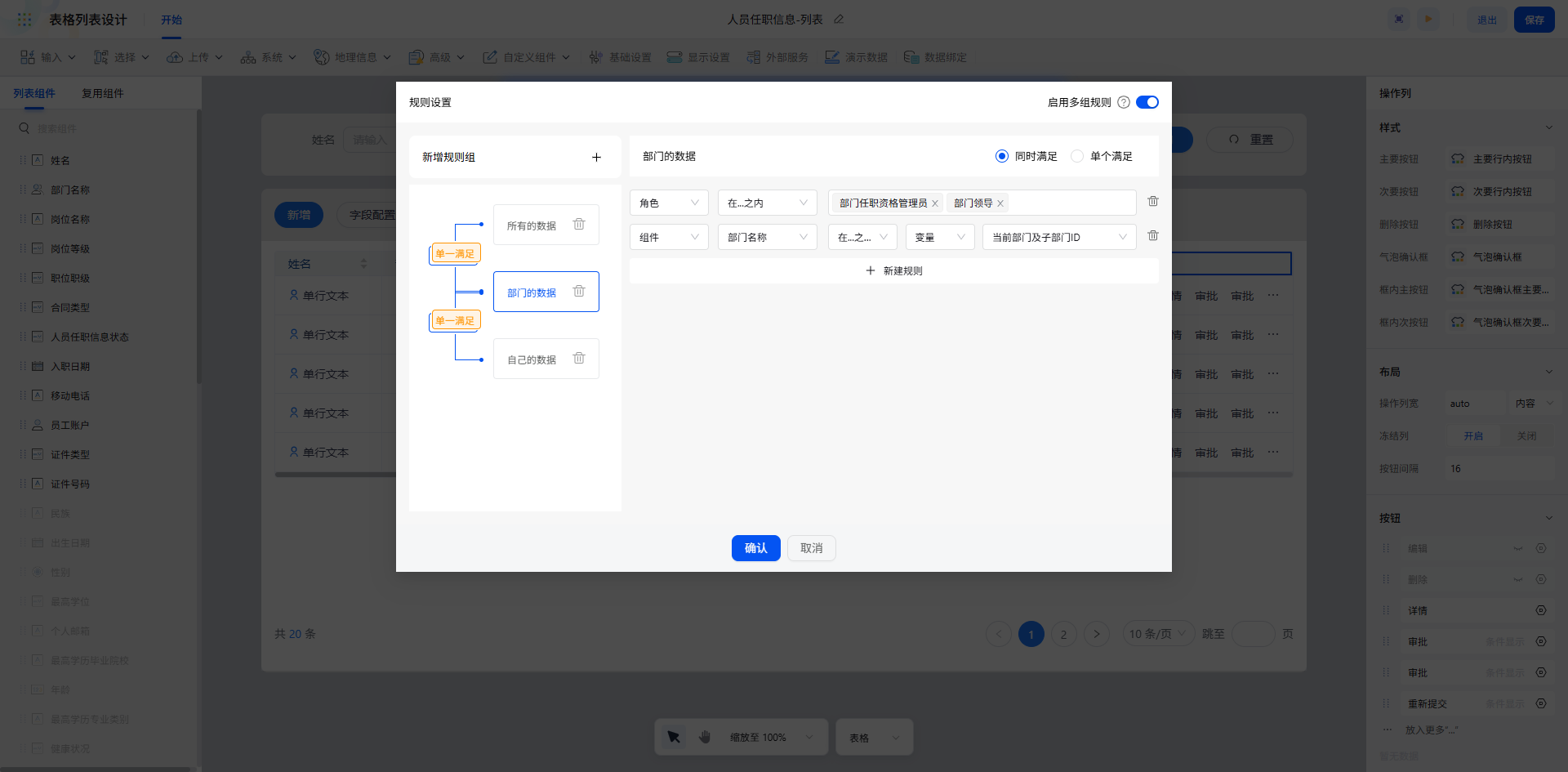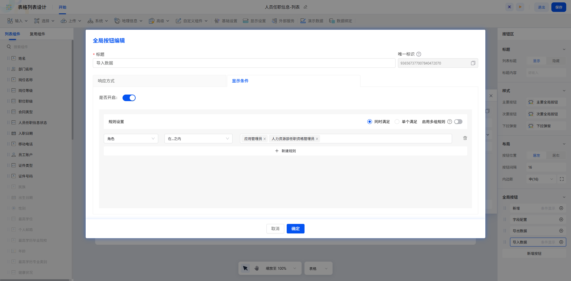 现在,我们已经完成了业务流相关权限的配置。接下来,我们聚焦到人员任职信息的列表页,配置列表的全局按钮和行内按钮的操作权限。