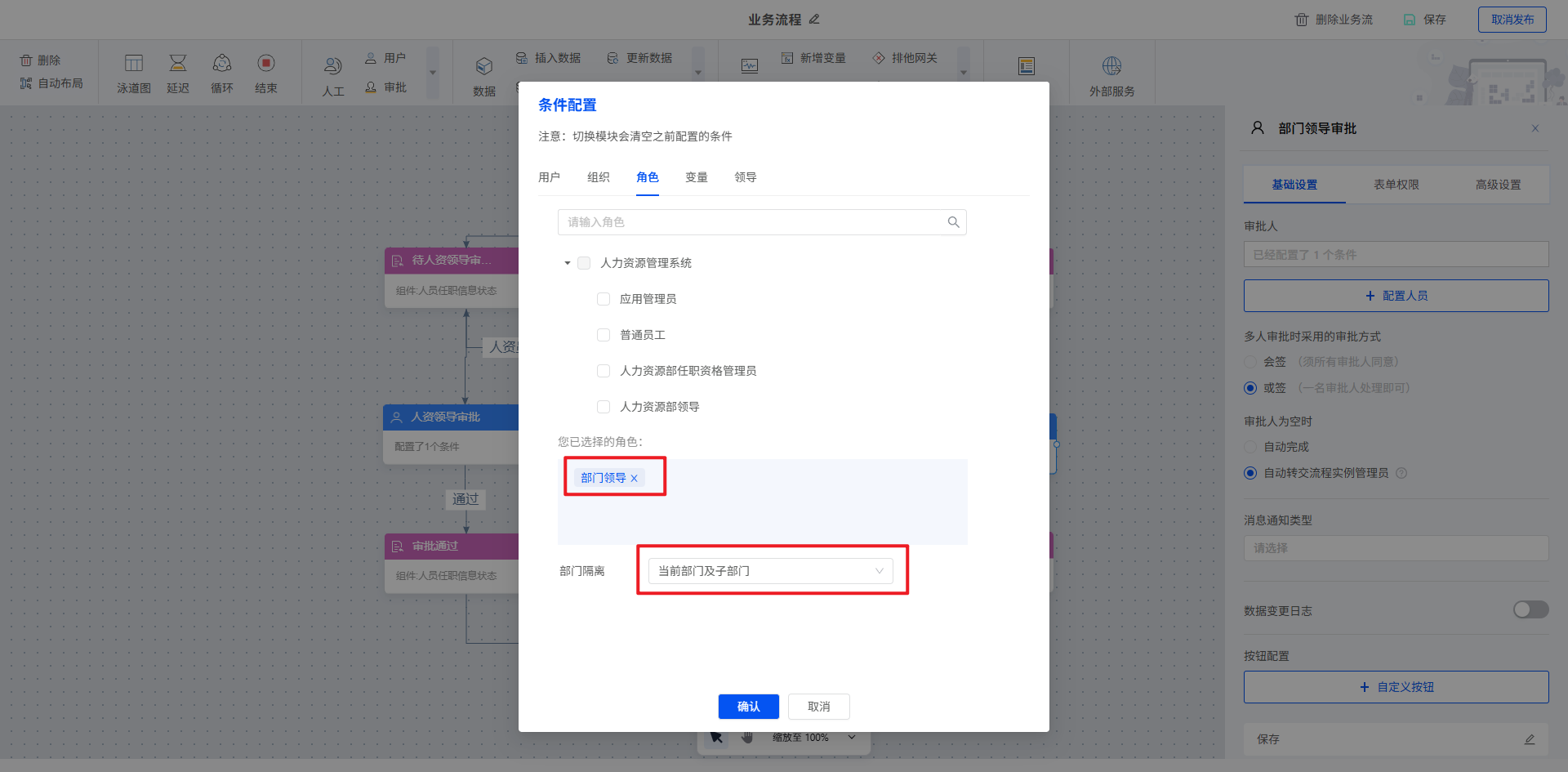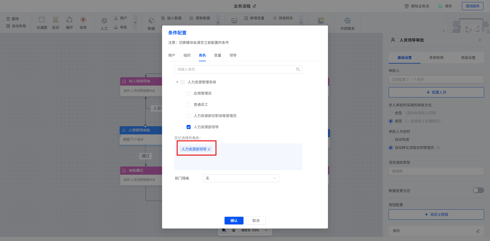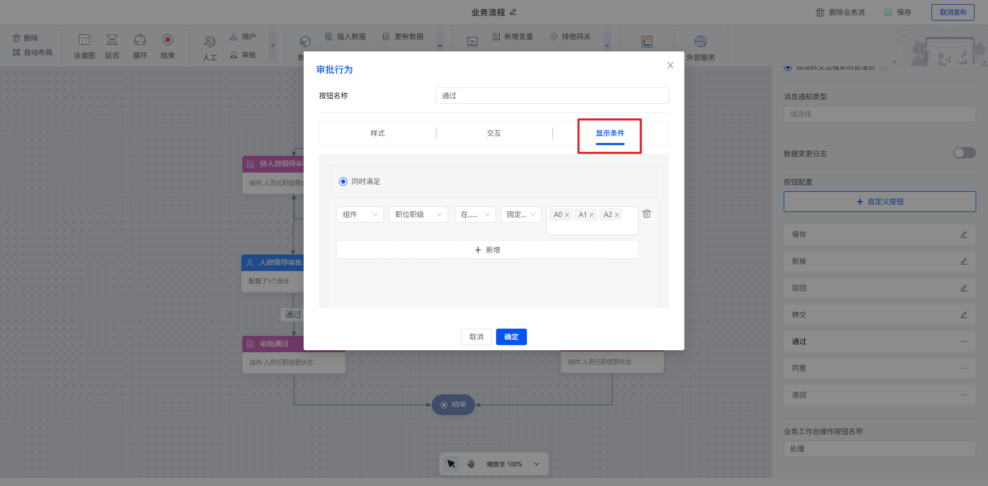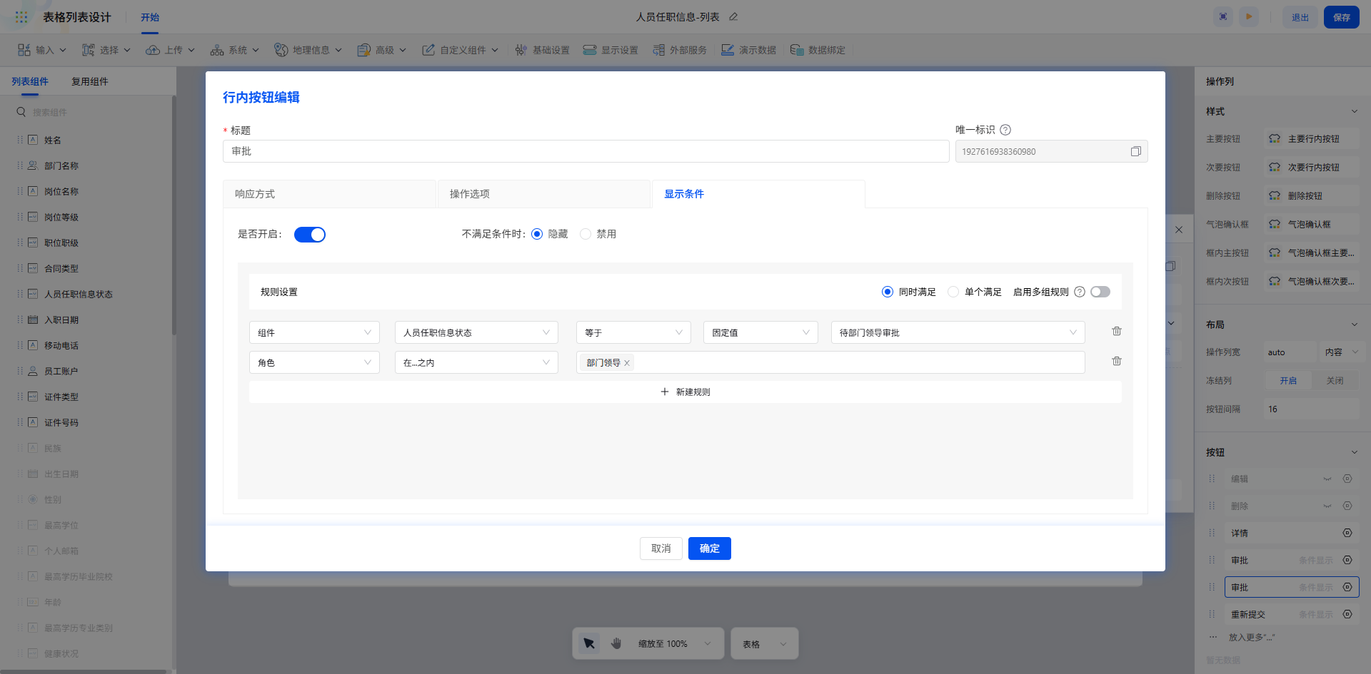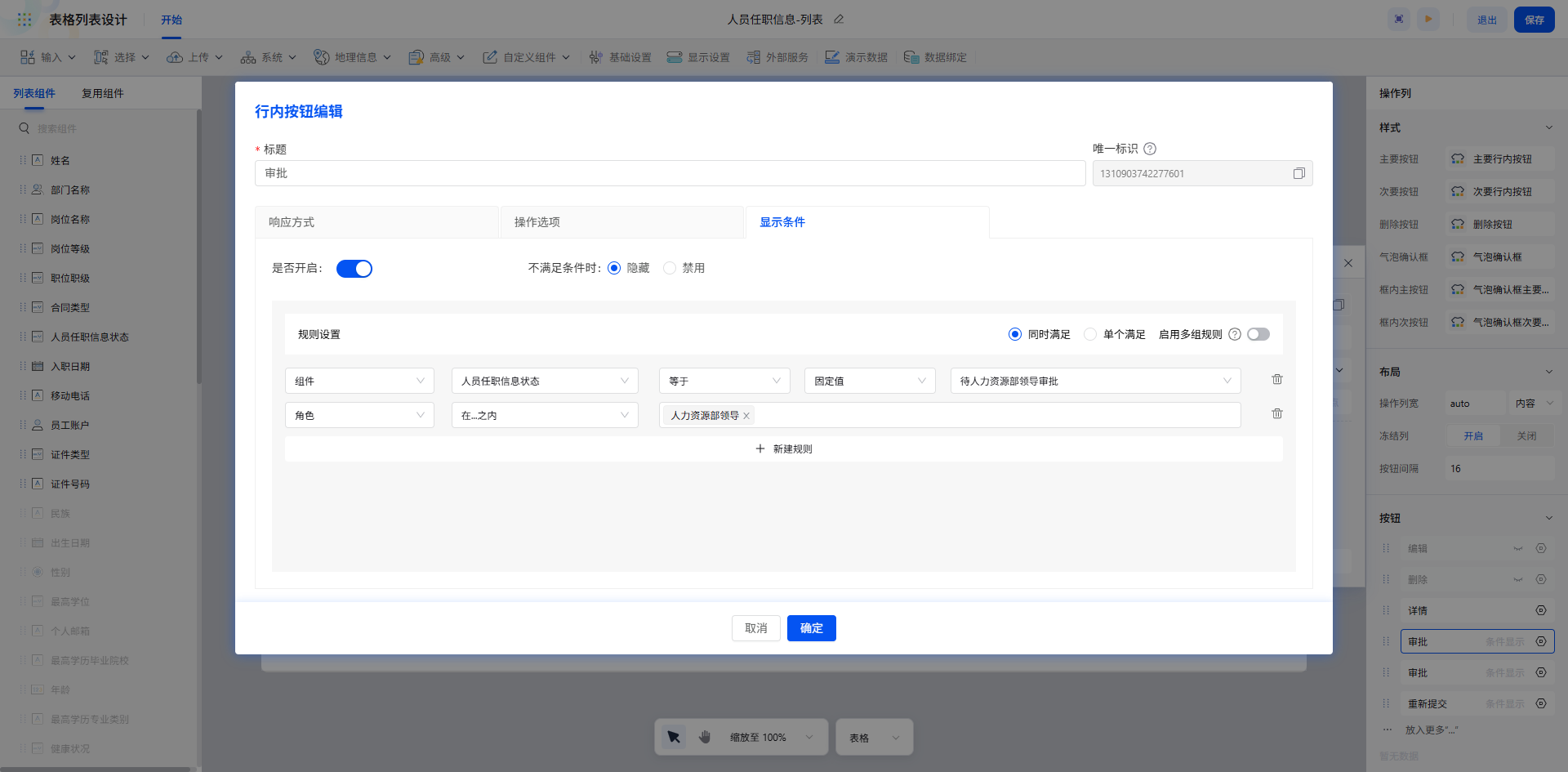 下面我们来到行内按钮。第一个审批按钮,人力资源部领导拥有审批权限。所以在显示条件中进行配置,当状态等于:待人力资源部领导审批,角色为:人力资源部领导,两个条件同时满足时按钮才会显示。