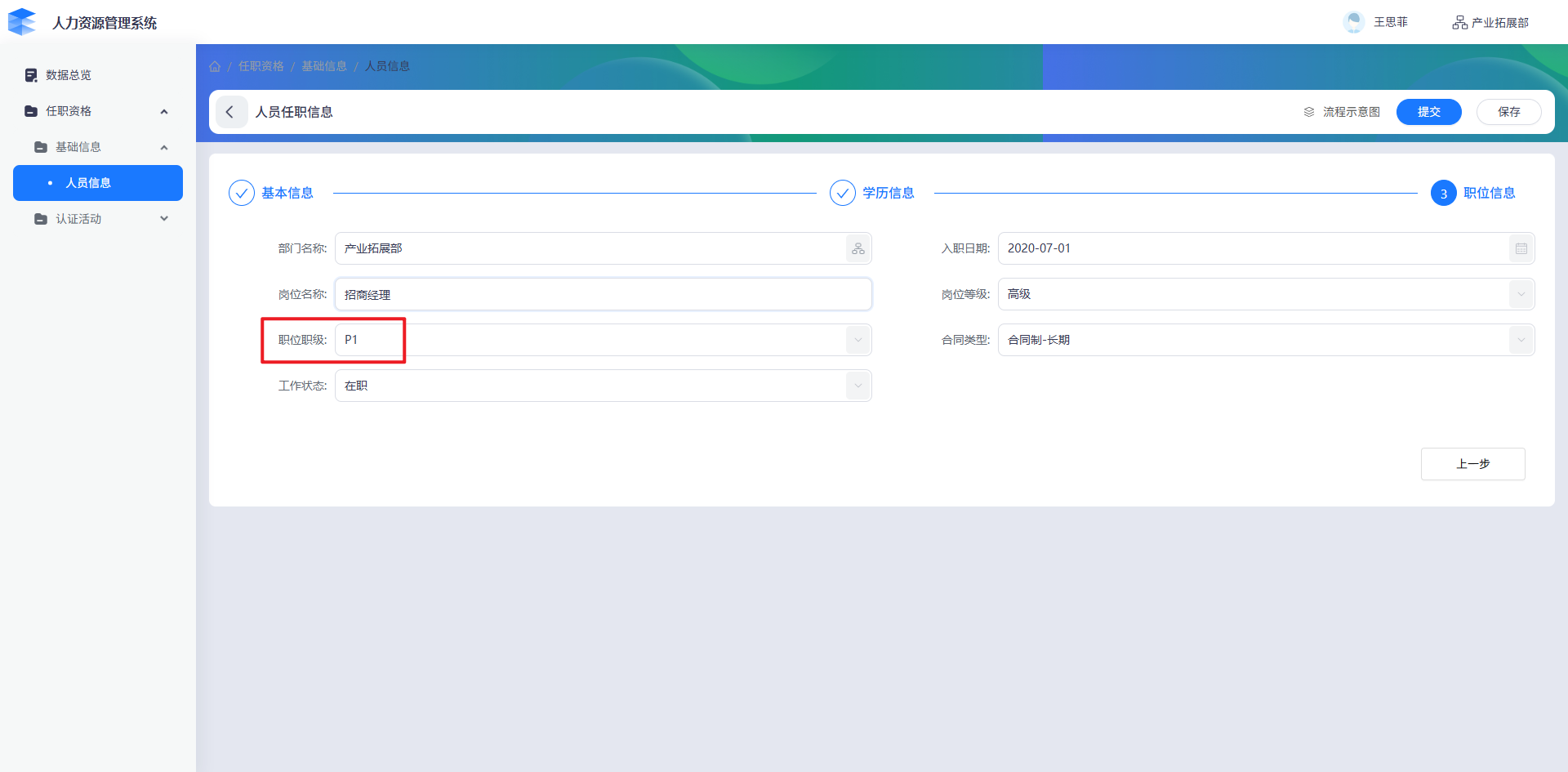 预览应用,登录一个部门任职资格管理员账户进行权限相关的测试。新增一条员工任职信息,职位职级选择大于 A 级,完成后提交。