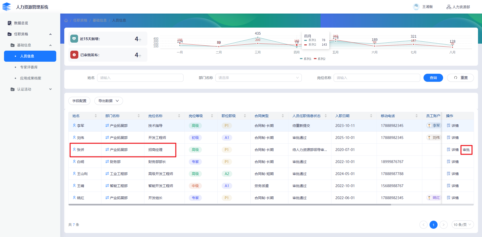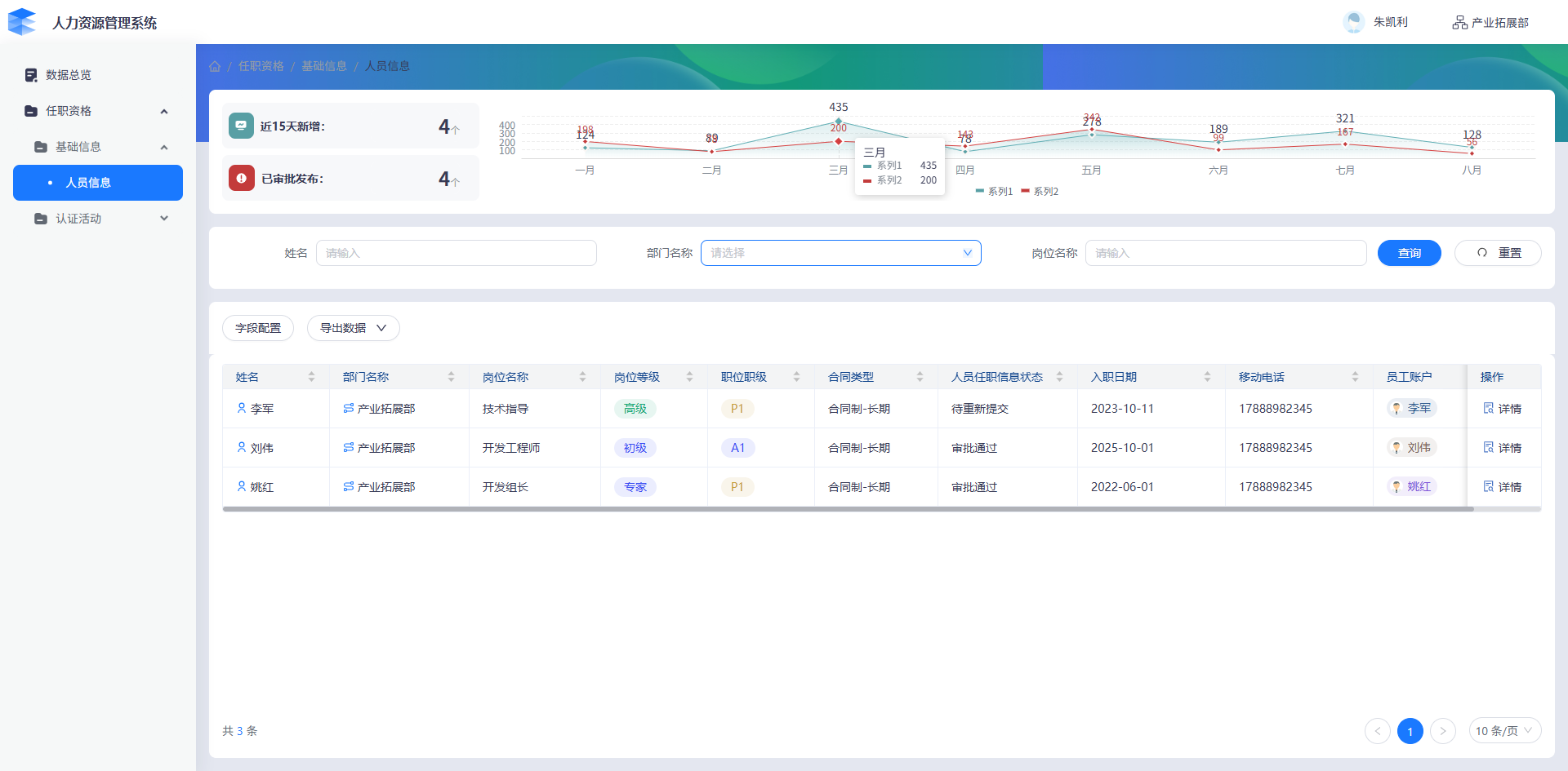 ○ 人员信息库:集中管理全体员工的档案,不仅包括基本信息,更关键的是整合其教育背景、项目经历、技能证书等与任职资格相关的能力数据;