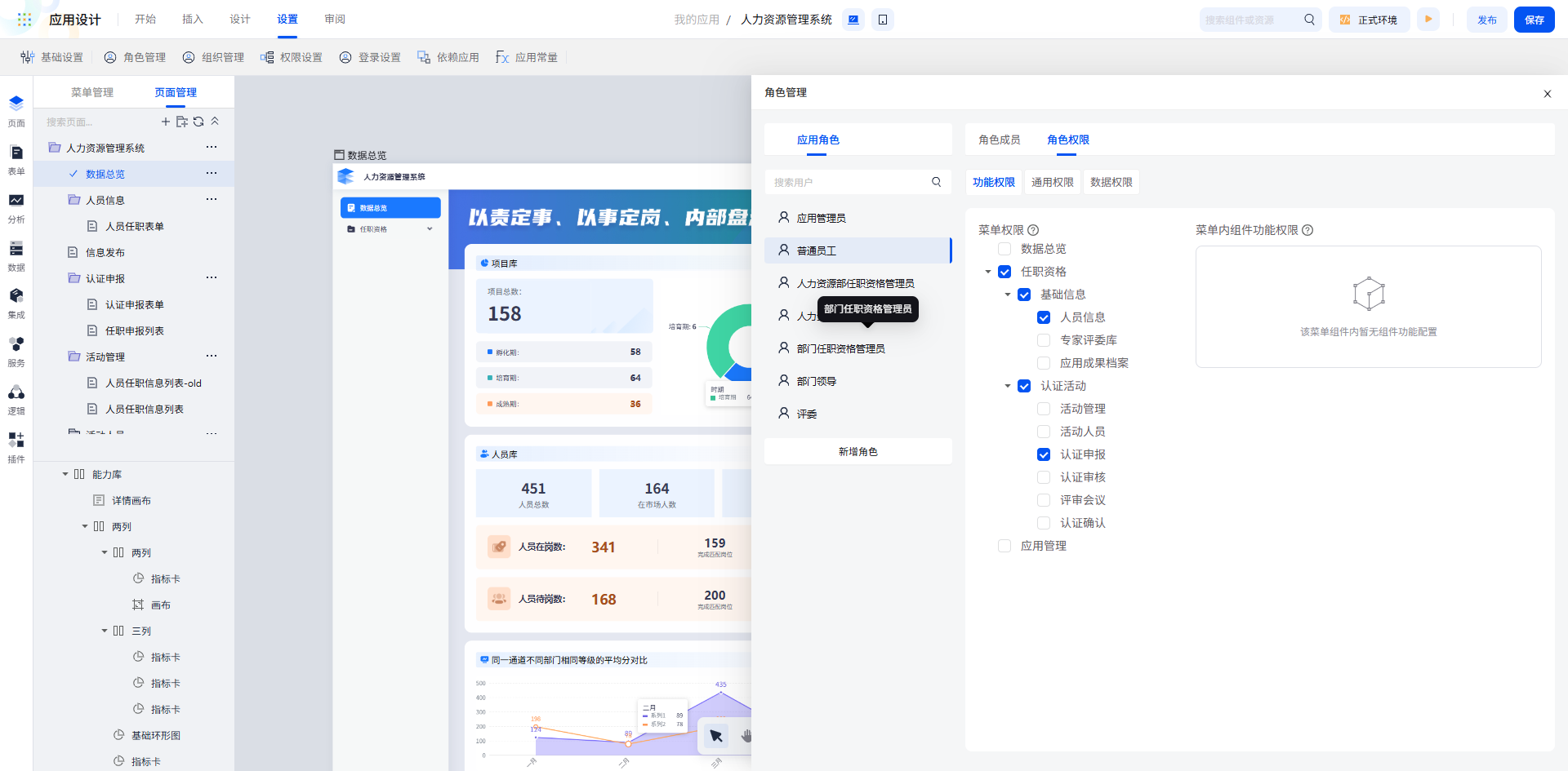 我们通过“应用角色-菜单权限”配置来控制用户能够访问系统的哪些菜单。例如,对于“应用管理员”‘角色,为其授予所有菜单的访问权限。而对于“普通员工”角色,仅能查看人员信息和认证申报这两个菜单。同理,其他角色也依次设定权限。