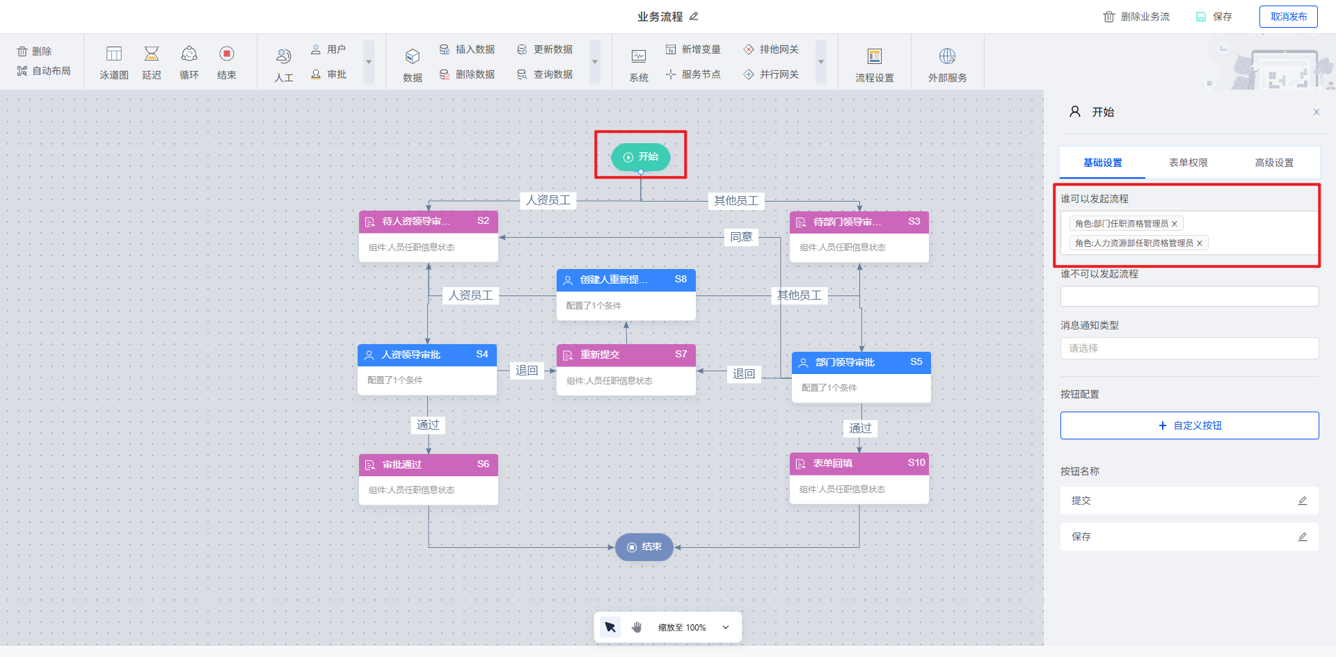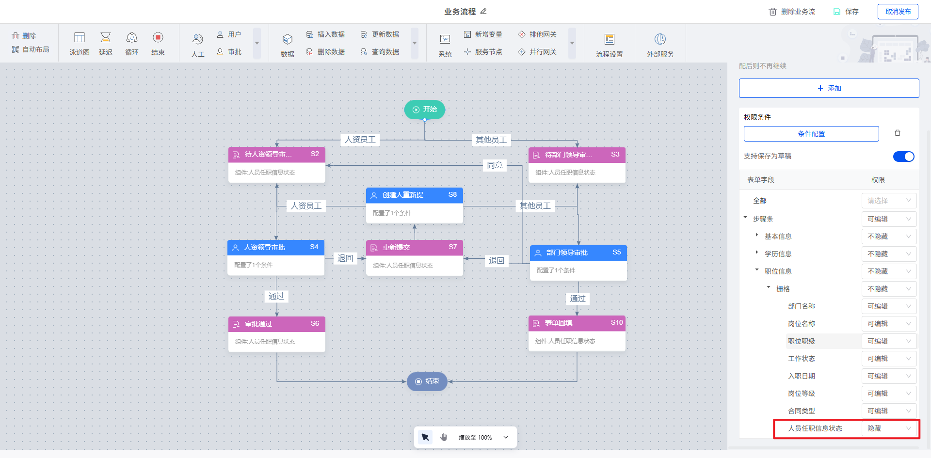 在开始节点中,我们设定人力资源部和其他部门的任职资格管理员都可以新增人员任职资格表单,表单权限中能够快速隐藏不需要填写的状态字段。