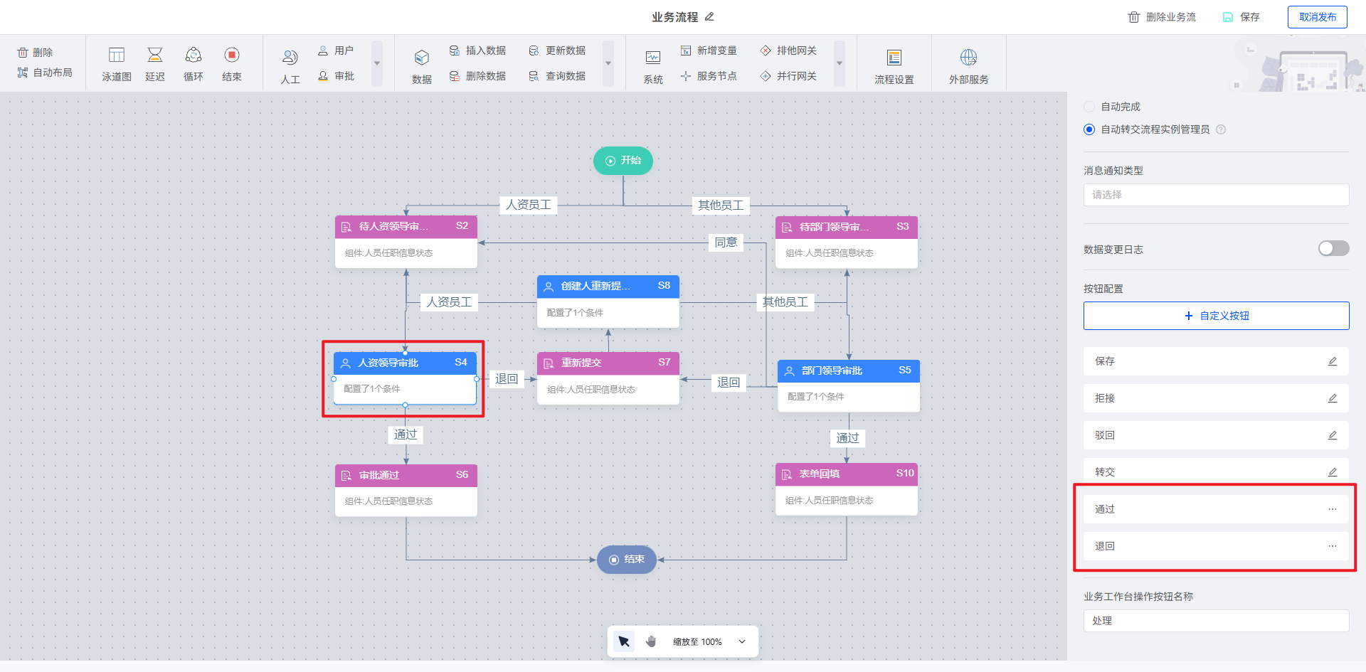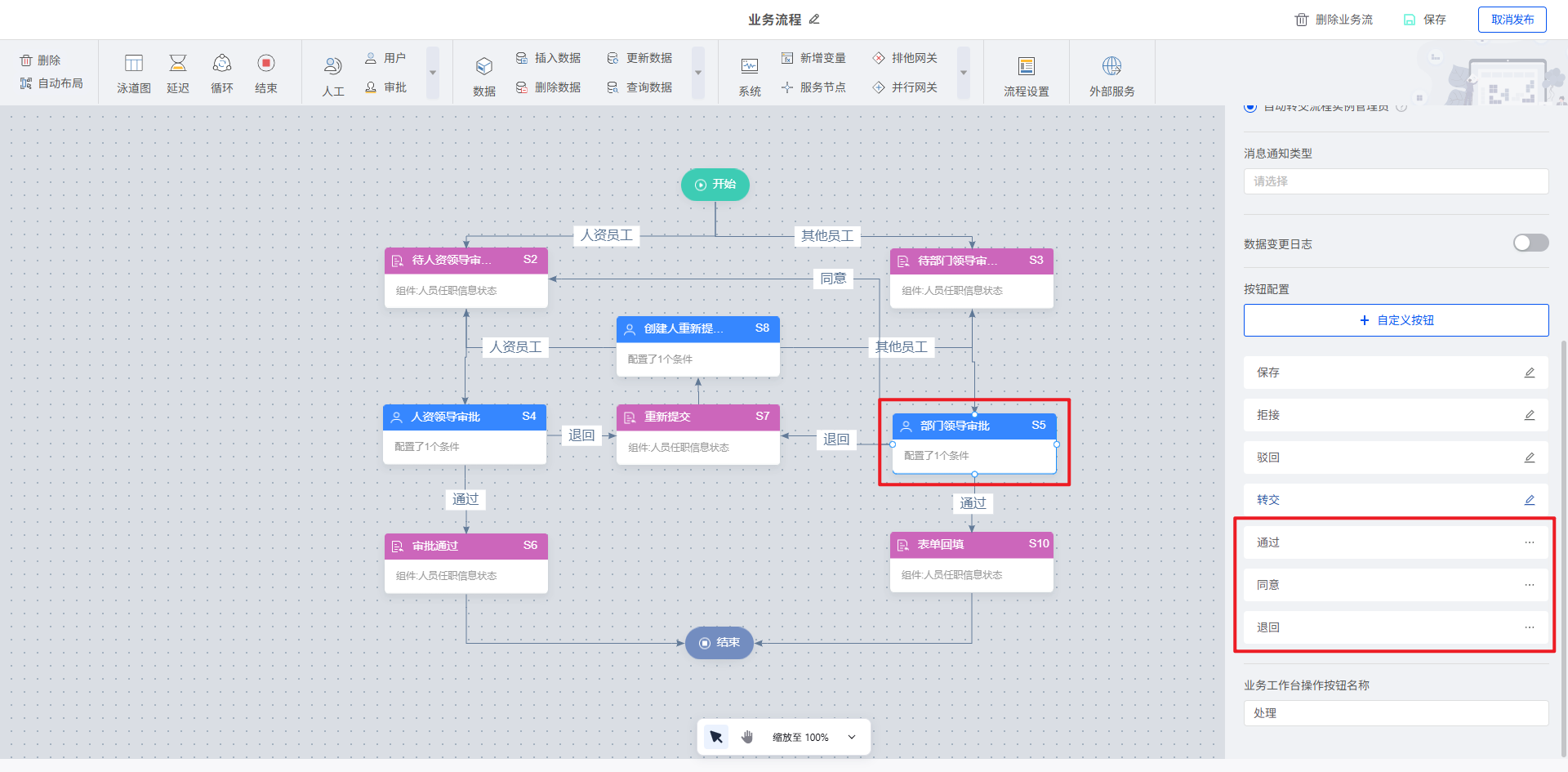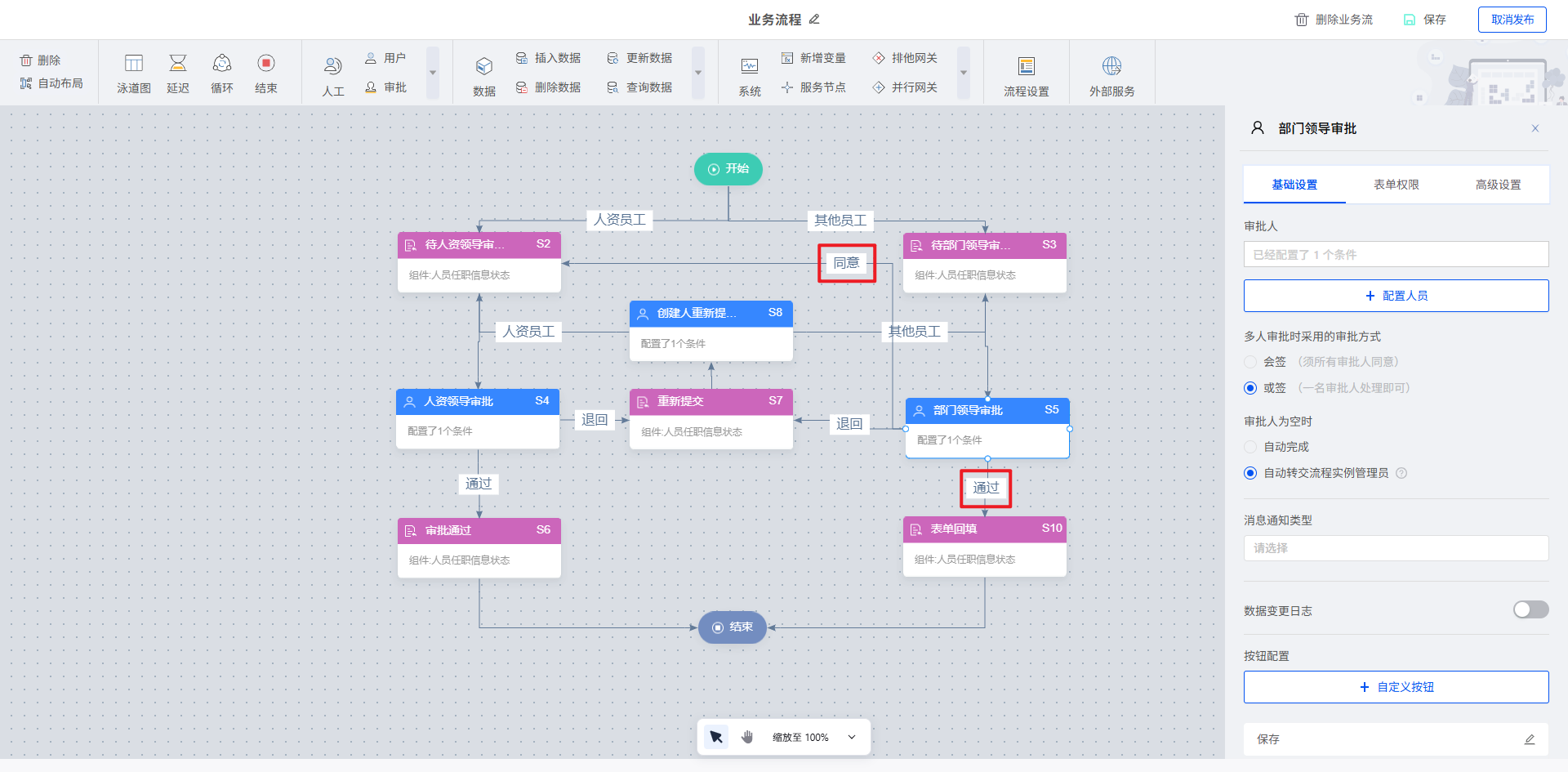 部门领导节点:如果任职的员工的职级超过 A 级,需额外经过人力资源部领导审批。新增“通过”与“同意”两个按钮,并配置显示条件:“通过”按钮仅当员工职级为 A 级时对领导可见,点击后可实现一键快速审批并结束流程;“同意”按钮则适用于更高职级的审批流程,点击后触发二次审批流程,来到人力资源部领导处审批。