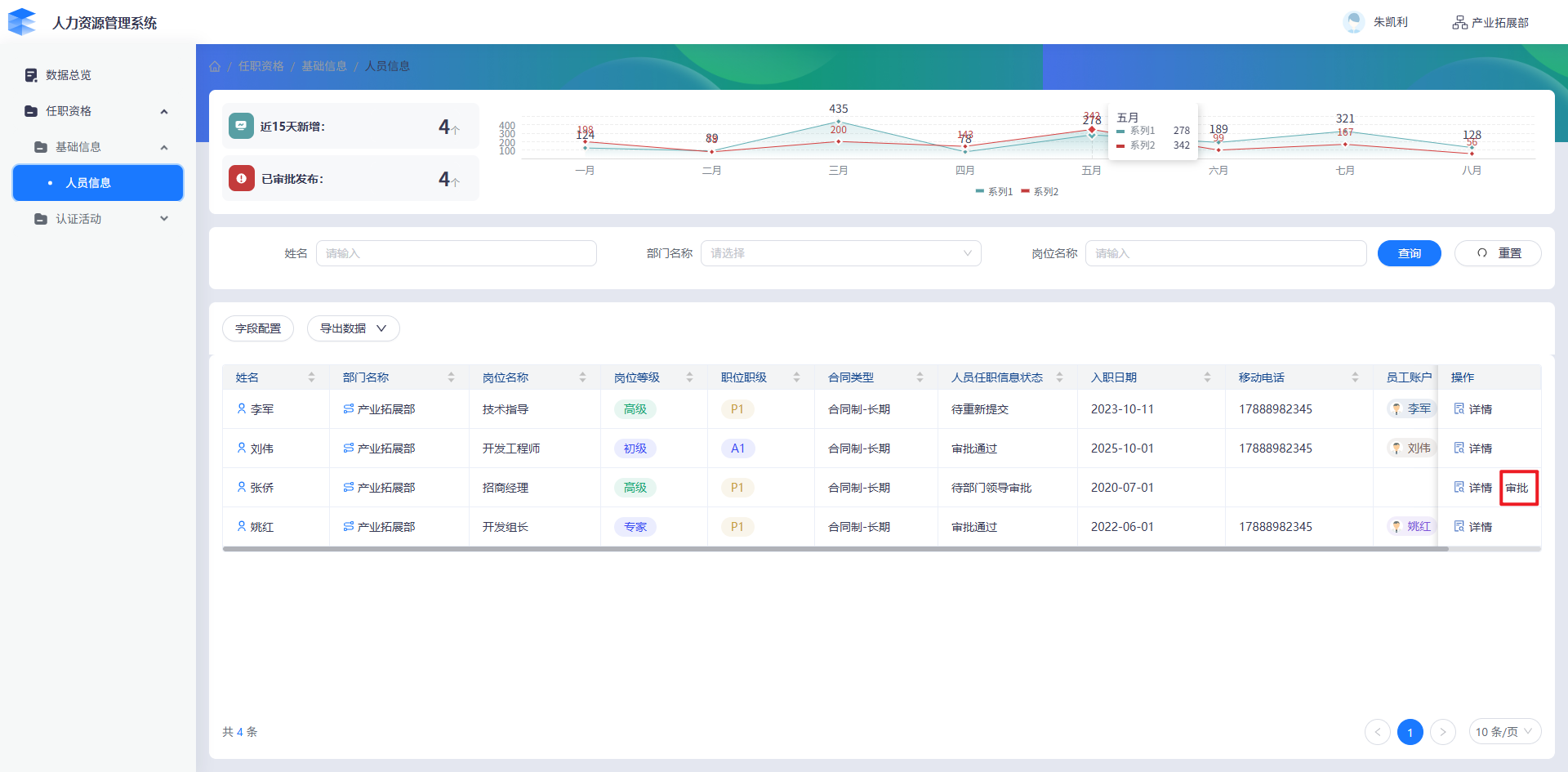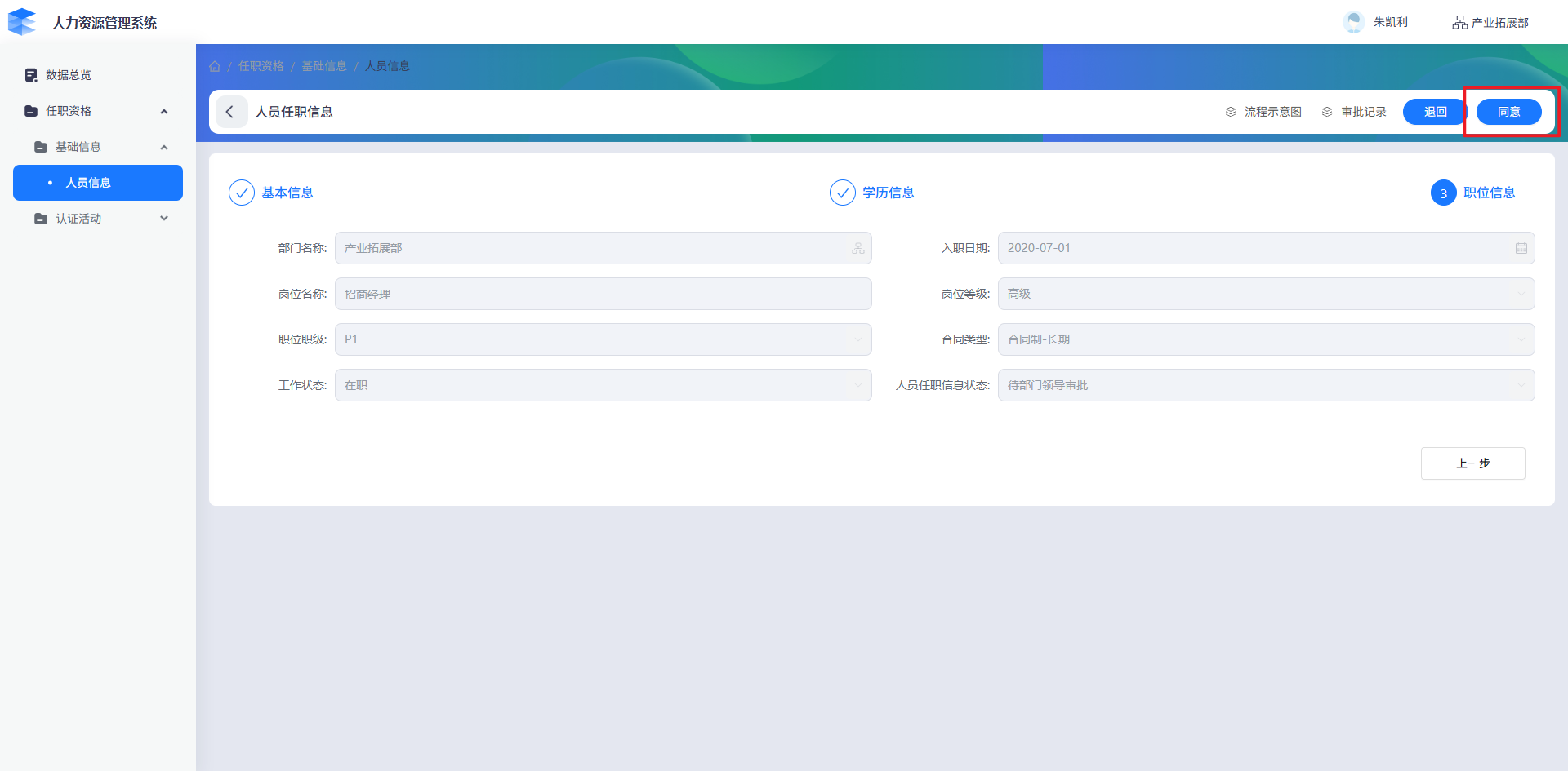 点击“同意”后,由于职位职级选择大于 A 级,会来到人力资源部领导进行二次审批。