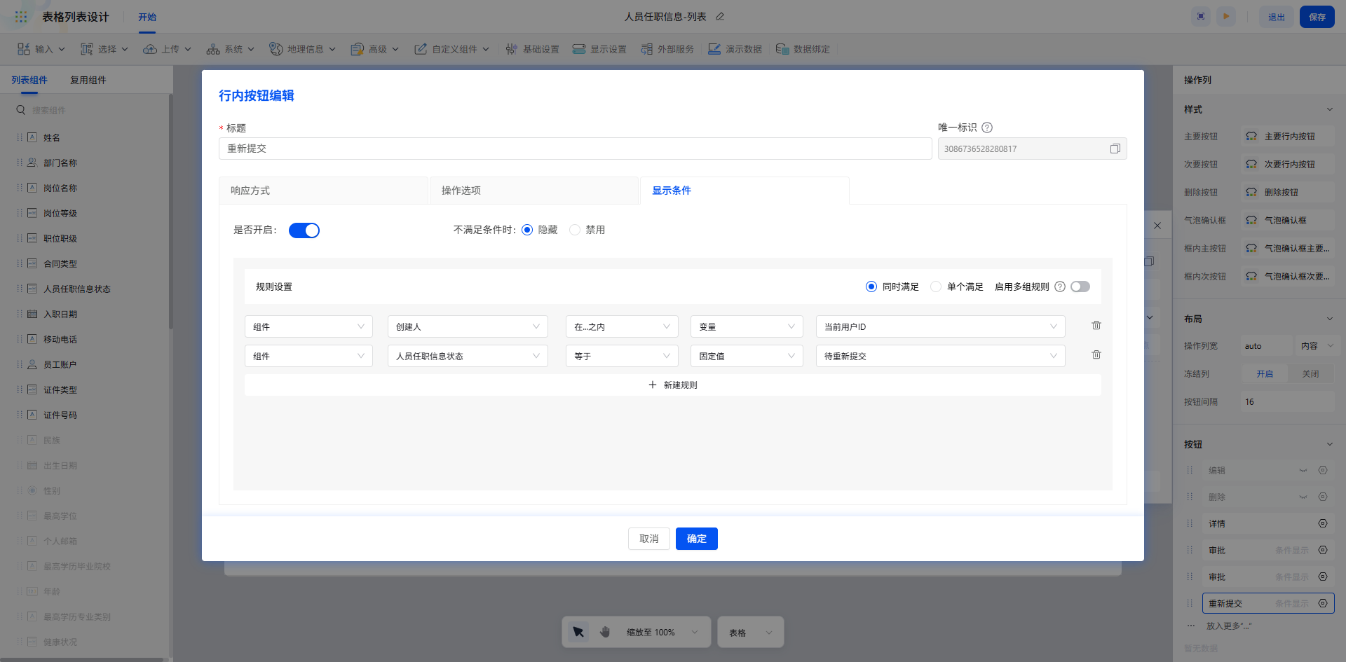 如果我们还希望包含一个重新提交按钮,用于该条数据退回后,创建人进行重新提交。只需在显示条件中设定创建人与当前用户 ID 进行匹配。