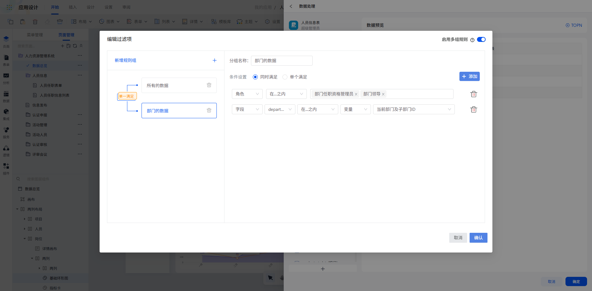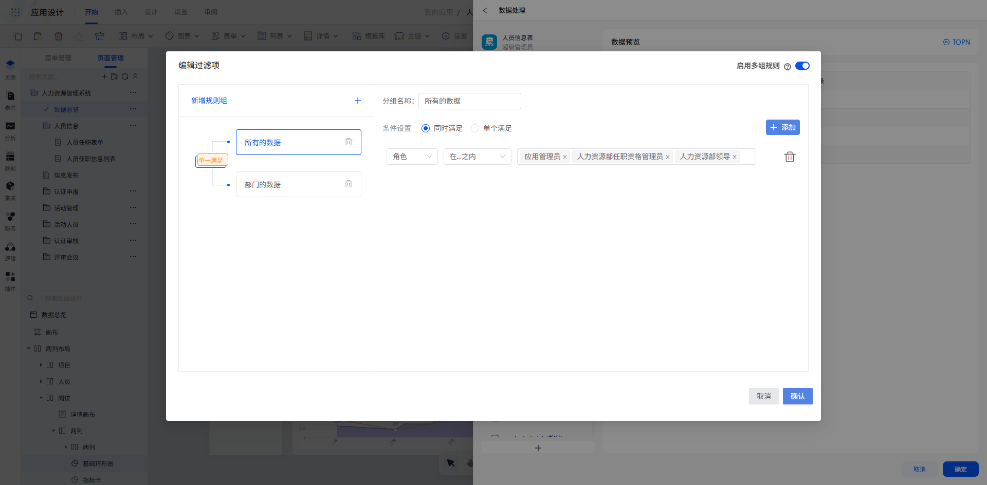 开启数据权限的多组规则。第一个是查看所有数据的规则组,若用户角色为应用管理员、人力资源部任职资格管理员或人力资源部领导其中之一,即可根据此规则组查看全部数据。