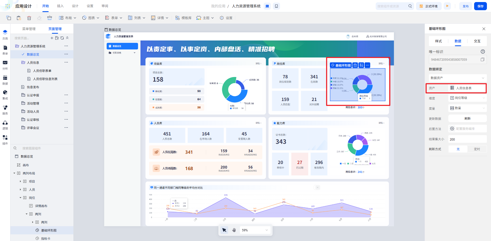 操作非常简单!选中岗位等级统计的环形图,进入数据资产的配置页面,找到“岗位等级”这个需要过滤的关键字段,为其添加过滤规则。