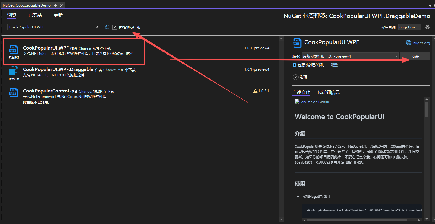 在 NuGet 包管理中搜索:CookPopularUI.WPF