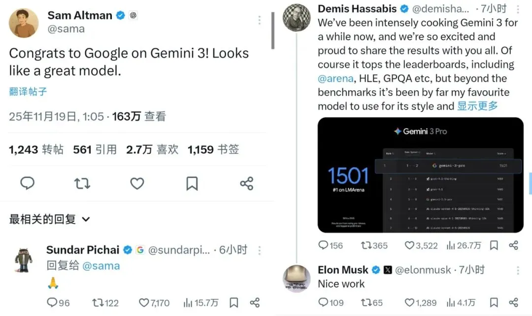 有趣的是,OpenAI CEO Sam Altman 刚刚也在 X 平台发文称:「恭喜 Google 成功推出 Gemini 3!看起来是个很棒的模型。」而马斯克则是表示「做得好」。