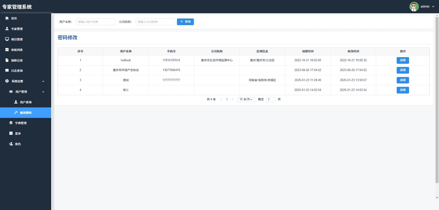 修改密码:提供用户修改账户密码的功能,增强账户安全性,保障系统访问的合规性。