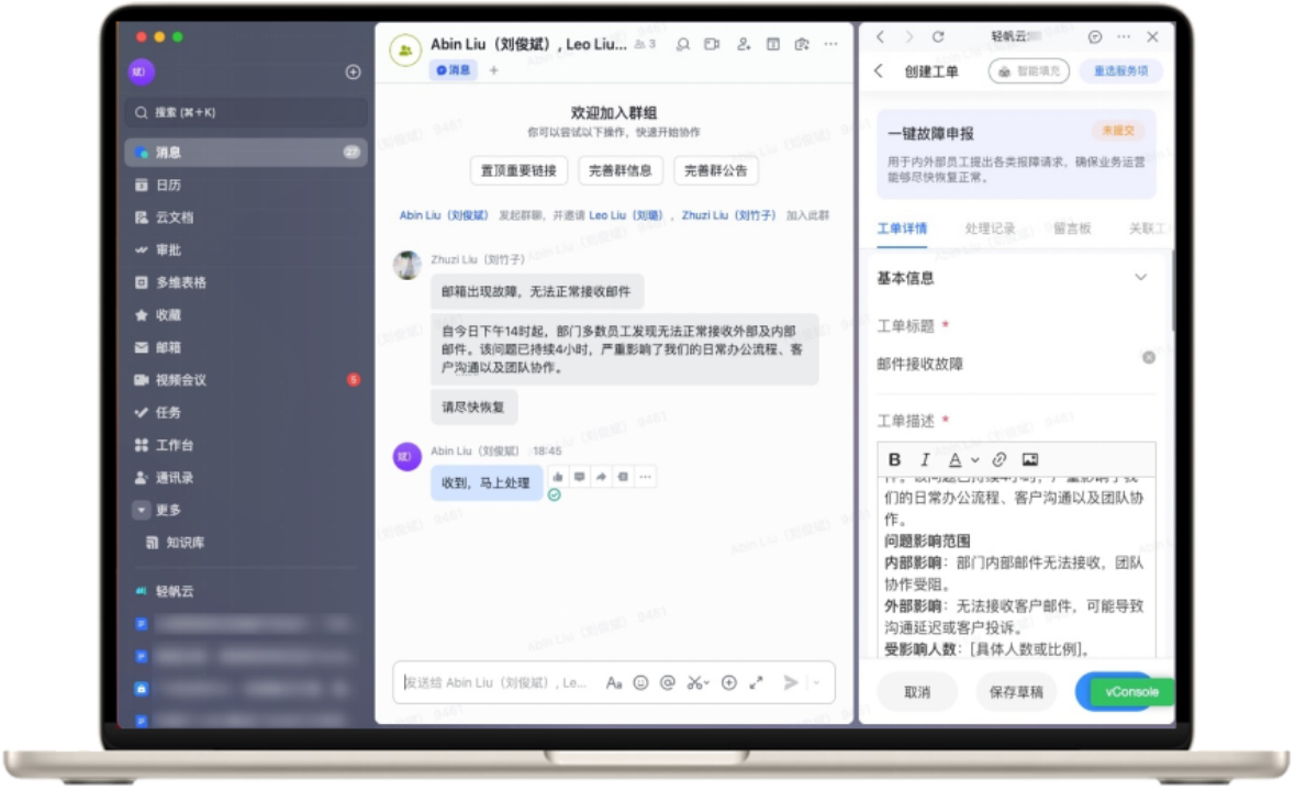 群聊消息快捷建单:在第三方聊天群组(如飞书、钉钉)抓取关键词(如 “网络中断”),自动填充工单内容,提升建单效率。