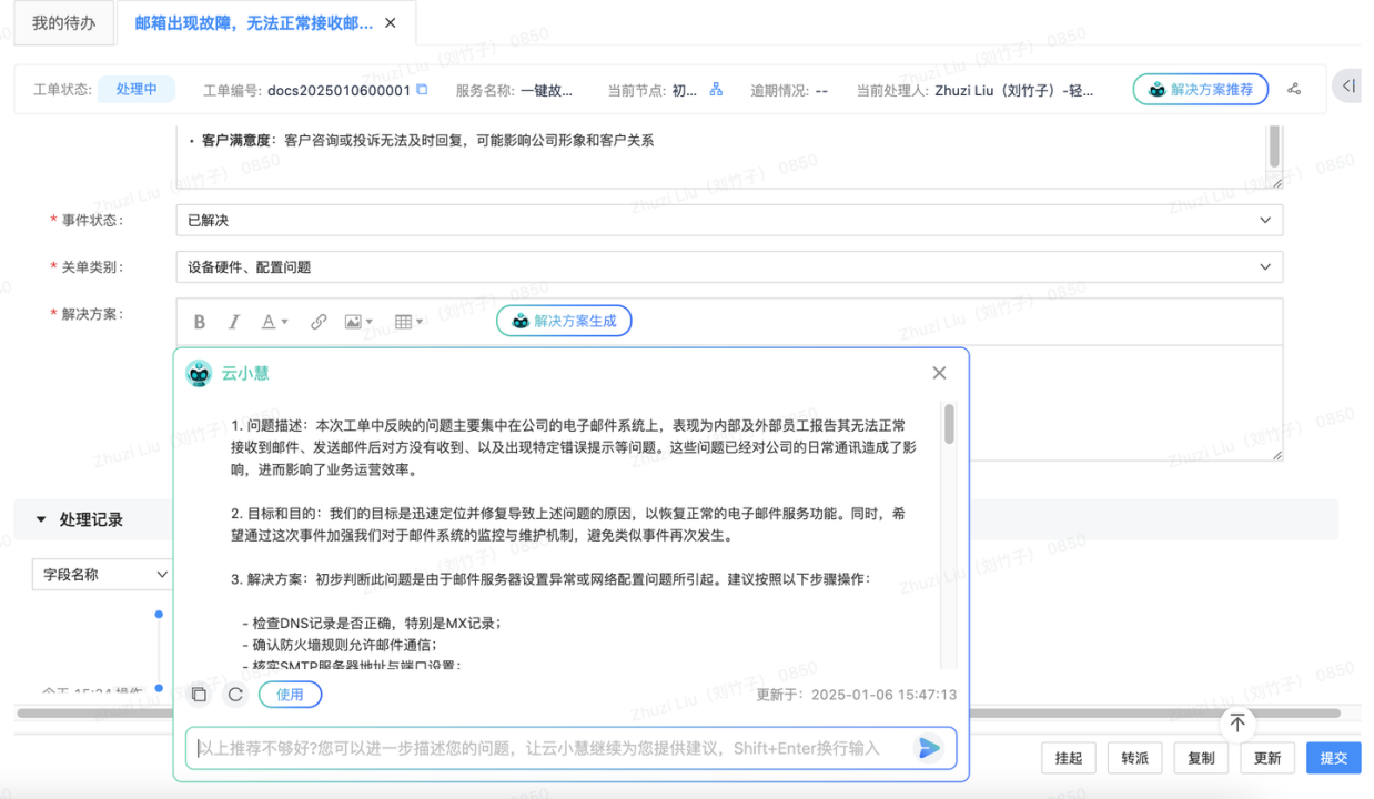 轻帆云ITSM的智能化并非概念,而是贯穿于工单全流程的具体应用。其内置的 AI 助手“云小慧”(基于自研大模型 CloudwiseGPT 与 RAG 技术),在以下场景中发挥着关键作用:
