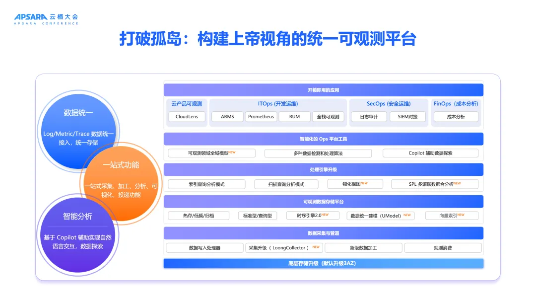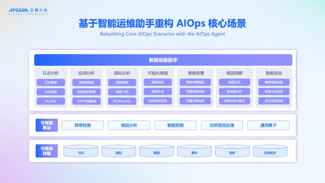 无论是业务运行的健康度洞察、安全威胁的快速响应,还是研发交付的持续优化,Operation Intelligence 正在 BizOps、SecOps 和 DevOps 三大关键领域发挥核心作用。而云监控 2.0 专注于 AIOps,通过日志、指标、追踪和实体行为的深度融合,为运维提供依据。同时,为应对 AI 原生时代的挑战,云监控 2.0 构建覆盖 AI 应用层 → 平台服务层 → 基础设施层的 AI 全栈可观测体系,打造从数据采集到智能决策的完整闭环。