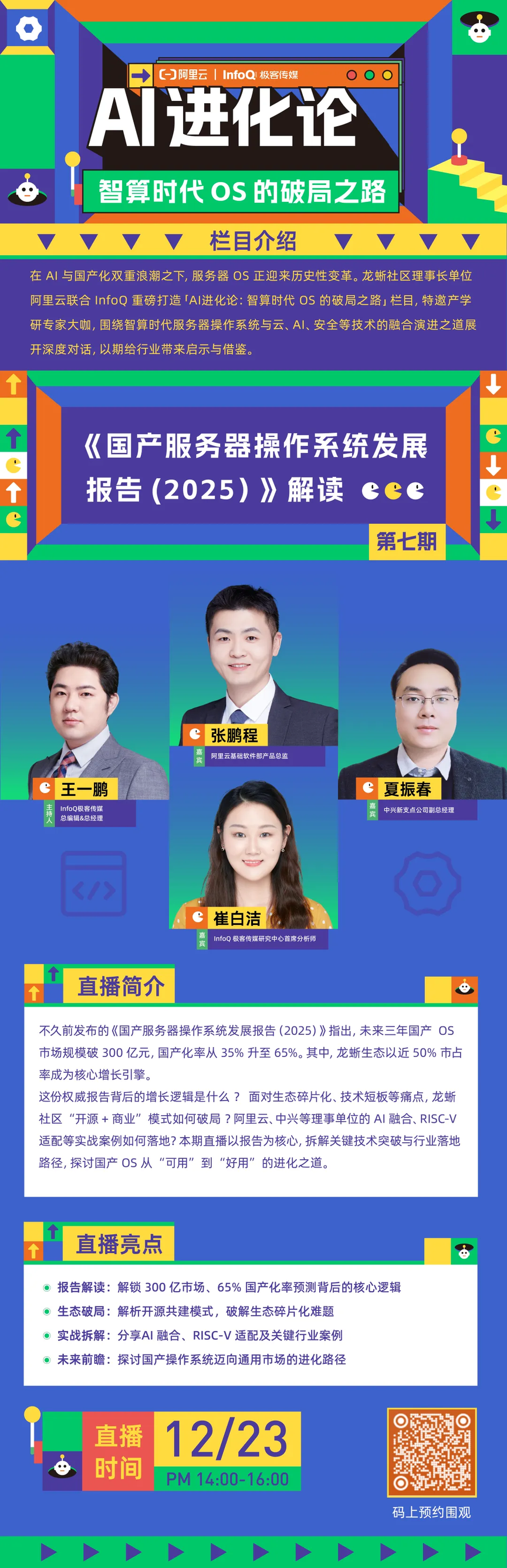 这份权威报告背后的增长逻辑是什么?面对生态碎片化、技术短板等痛点,龙蜥社区 “开源 + 商业” 模式如何破局?阿里云、中兴通讯等理事单位的 AI 融合、RISC-V 适配等实战案例如何落地?《AI 进化论:智算时代操作系统的破局之路》系列直播第七期将于 12 月 23 日 14:00 开始,特别邀请到阿里云基础软件产品总监张鹏程,中兴新支点公司副总经理夏振春,InfoQ 研究中心首席分析师崔白洁,InfoQ 极客传媒总经理、总编辑王一鹏四位嘉宾,就近期发布的《国产服务器操作系统发展报告(2025)》展开深度探讨。本期直播以报告为核心,拆解关键技术突破与行业落地路径,探讨国产 OS 从 “可用” 到 “好用” 的进化之道。