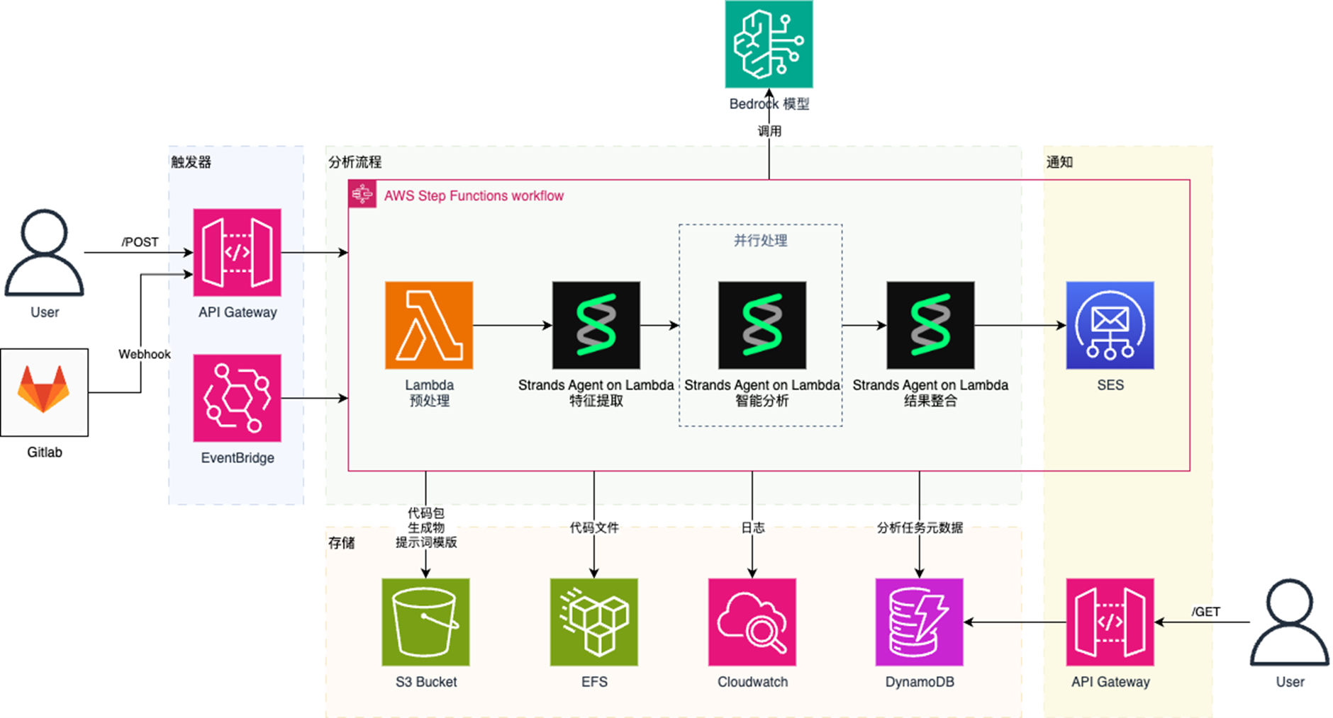 事件驱动触发:当代码文件上传到 Amazon S3 时自动触发分析流程,支持批量处理和增量分析。